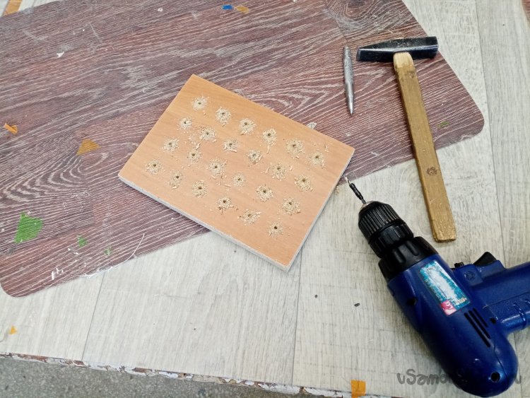 В ненужном кусочке фанеры засверливаюсь. В бой вступает мой старинный шуруповерт. Между прочим оригинальной конструкции фирмы «LG». Некоторое время назад поменял аккумуляторы. И аппаратик как новый.