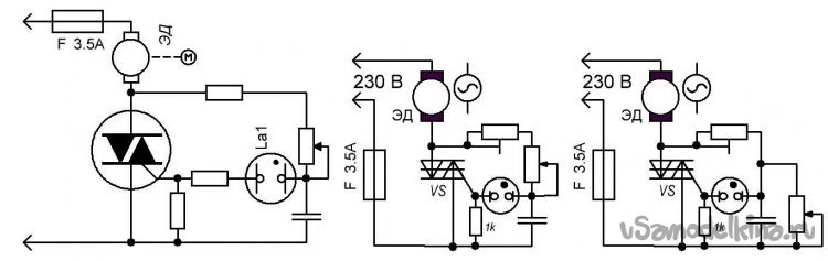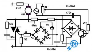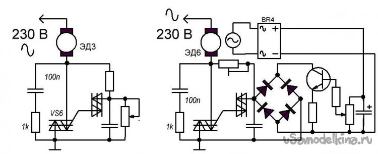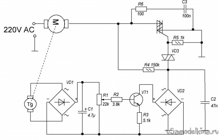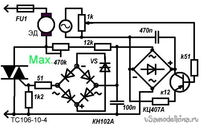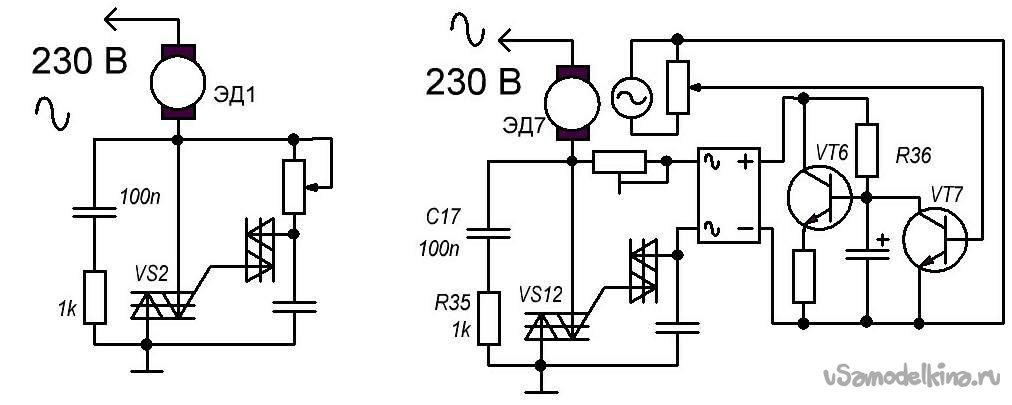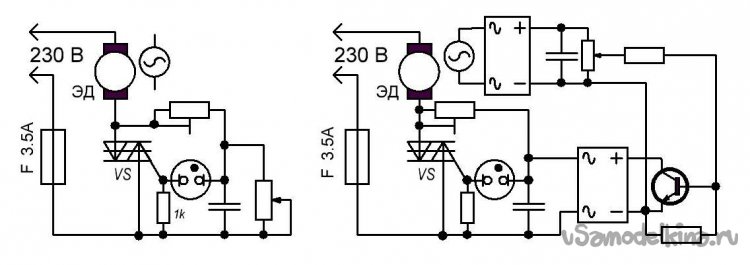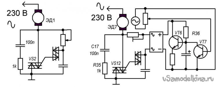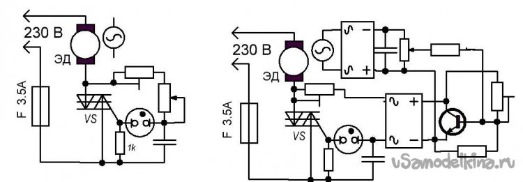 Ничего сложного, как правило, это симисторный регулятор с симметричным же динистором в роли порогового элемента. Регулирующий элемент - 2 варианта, либо переменный резистор в цепи зарядки времязадающего конденсатора, либо переменный резистор параллельно этому конденсатору (можно и совместить). Соответственно, автоматизация заключается в замене переменного резистора транзистором, управляемым от тахогенератора. Вот, внизу, две схемы из сети с реализацией первого варианта.