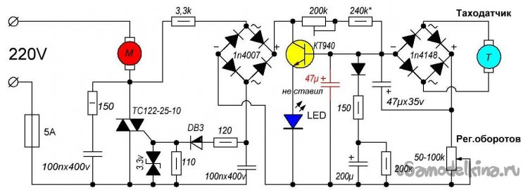 Ключевой момент – здесь резисторы R4 в первой схеме и 200 к+240 к во второй определяют уровень открывания регулирующего транзистора, а приходящий от таходатчика сигнал закрывает его. А вот внизу схема по второму варианту. Тут наоборот – в исходном состоянии регулирующий транзистор закрыт, а сигнал от таходатчика открывает его. Так мне как-то больше нравится…