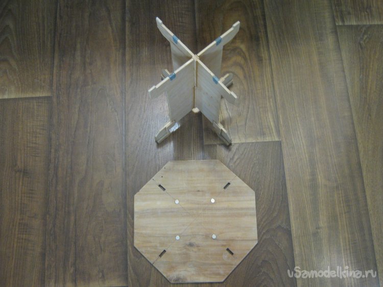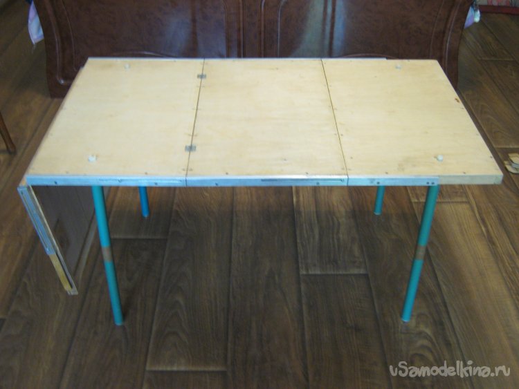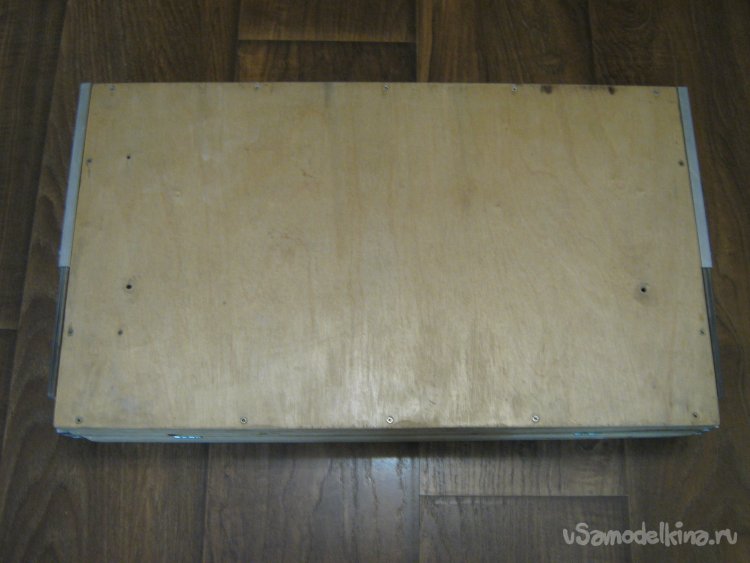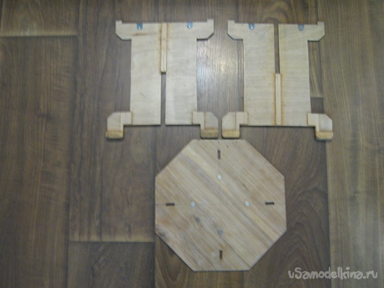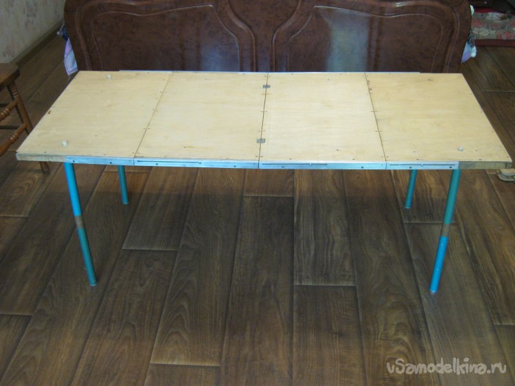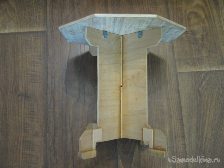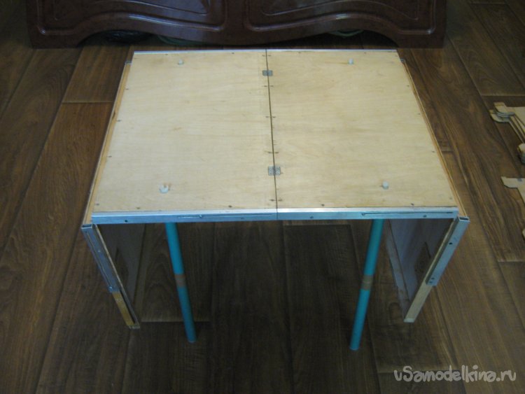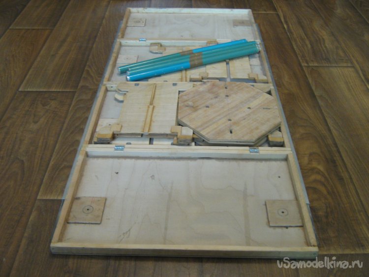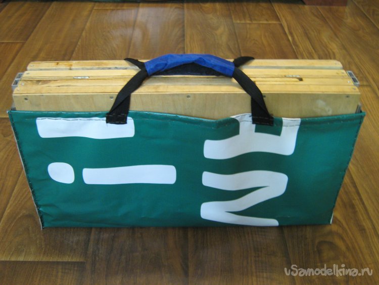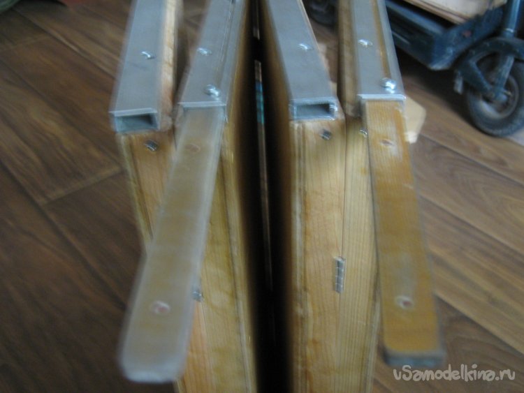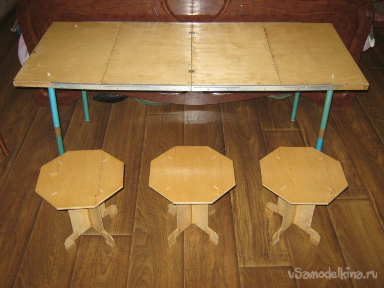 Уже который год верой и правдой ,как говорится, служит данный комплект самодельной походной мебели. Конечно же, обязательно найдутся людишки которые скажут: это все хлипенько! Может быть. Понимаю,что им нужно закинуть свою тушу в шезлонг и желательно,чтобы филейной части было помягче, но напоминаю-мебель походная, тоесть несешь сам. А комфорт и весит как знаем немало. Итак, в комплект входят : раскладной столик и три раскладных табурета. Стол можно разложить в три положения, в зависимости от количества человек. На двоих, на троих и на четверых. Столик выполнен в виде дипломата. В собранном виде размер 57х32х10 см,вес 7кг. В зависимости от количества человек могут использоваться две секции (на два человека, тогда размер столика 57х64см), три секции (на три человека, размер 57х96см), четыре секции ( на четыре человека, размер 57х128см). Столик выполнен из фанеры 5мм. Каждая секция по периметру обклеена прямоугольными деревянными рейками 2х2см для жесткости конструкции. По внешним сторонам секций прикреплены прямоугольные алюминиевые профили 10х20мм, внутри которых свободно двигаются стеклотекстолитовые направляющие, которые являются основной деталью жесткости, для предотвращения прогиба стола. Секции между собой крепятся шарнирно на петлях 2,5х2,5 см. Ножки стола сделаны из сочлененных двух алюминиевых труб диаметром 2,5 см. В моем случае я использовал трубы из сменных катриджей порошковых принтеров. Крепятся ножки к крышке стола на винт М4. Главное чтобы шляпка у винта была как можно шире. Табуреты также выполнены из фанеры: крышка из 10мм ,ножки из 5мм. Состоят из трех элементов: крышки и двух элементов сочленяемых крест-накрест в ножки. Единственная особенность :нижняя часть ножек утолщена до 20 мм, потому как с тонкими ножками под весом седока табурет начинает вдавливаться в почву. В крышке табурета имеются четыре неодимовых магнита, а на ножках четыре металлических пластины.Таким образом крышка держится на ножках. Усилия притяжения магнитов хватает для того, чтобы конструкция не развалилась, даже когда поднимаешь табурет за крышку. Кроме того на ножках есть шпунты, а в крышке прямоугольные пропилы для них. Вся конструкция быстро собираемо-разбираемая. Как показала практика вдвоем все это дело собирается за две-три минуты.