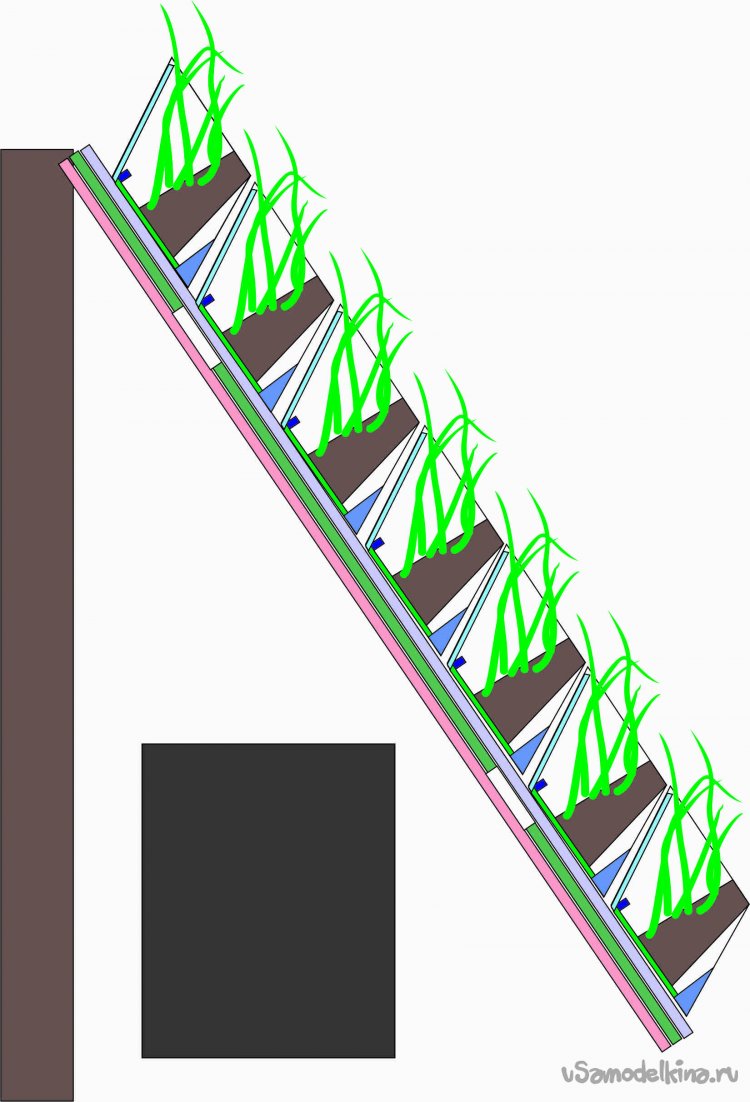 Солнечная панель, конденсатор воздуха, вихревая трубка Ранке. Система подает холодный поток воздуха по трубе металлической 20х40. На двух трубках крепится ряд контейнеров с растениями. Контейнер крепится к холодной трубе болтом. Болт за счет разности температур создает точку росы в контейнере. Конденсат через волокно попадает в грунт и нижний резервуар контейнера. Нужна производительность 6-10 литров конденсата в день для самополива растений