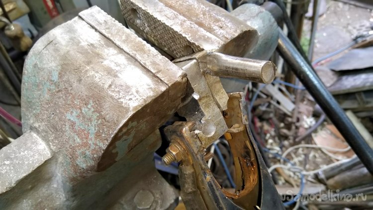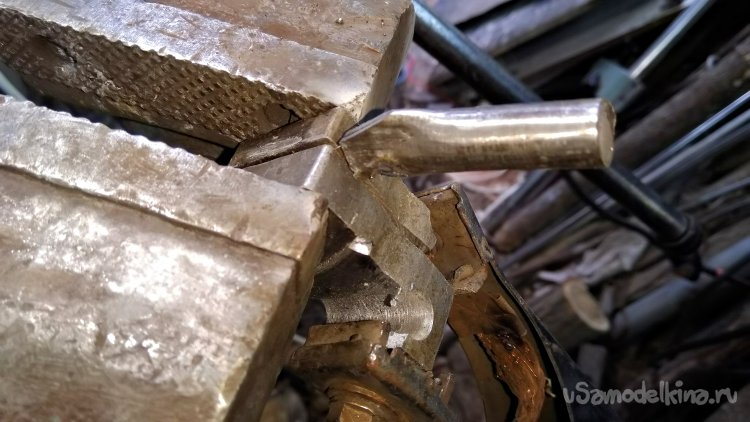 Вот этот маленький сегмент вставляю в прорезь обычной катанки проволоки диаметром 8 мм и привариваю электросваркой. Варю с теплоотводом от стали ножа, теплоотводы из кусков алюминия, короткими прикосновениями предварительно разогретого электрода удаётся прихватить без перегрева.