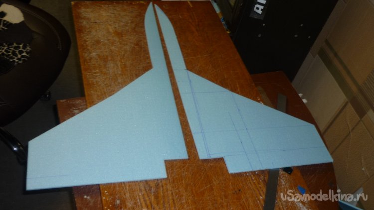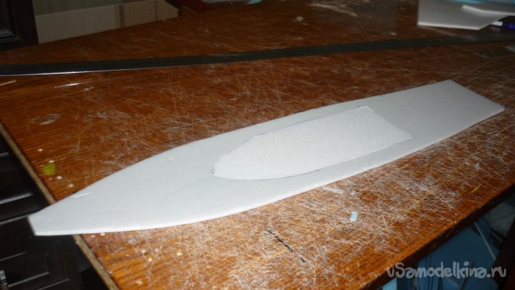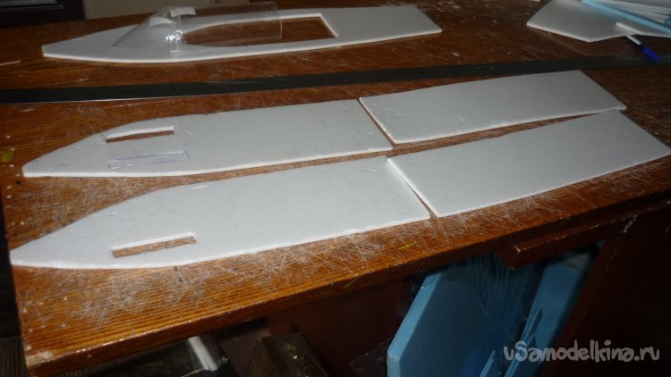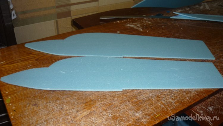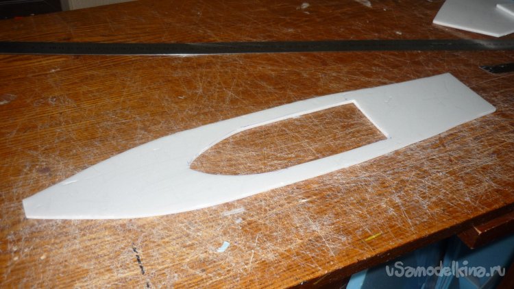 Из подложки вырезал две половины несущей нижней плоскости, нам которой будут монтироваться все остальные детали конструкции модели.