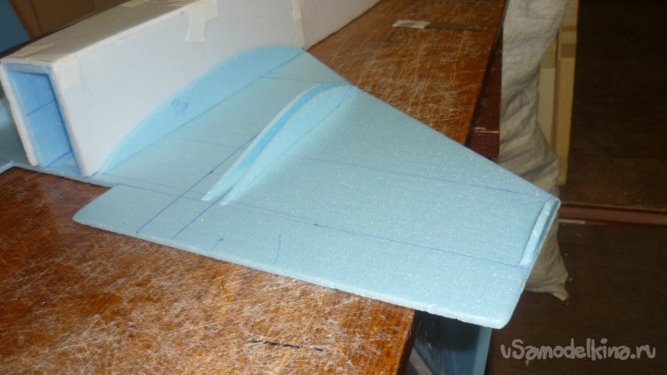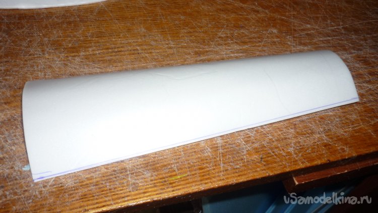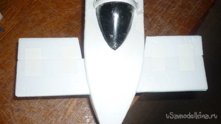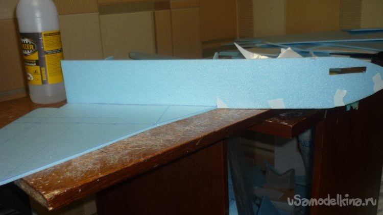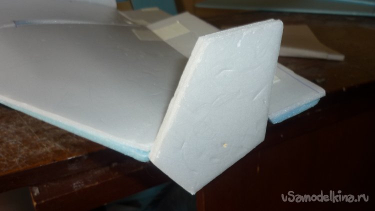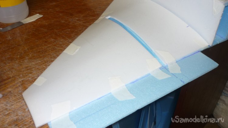 Из потолочки выкраиваю внешнюю обшивку крыла в средней части и монтирую.