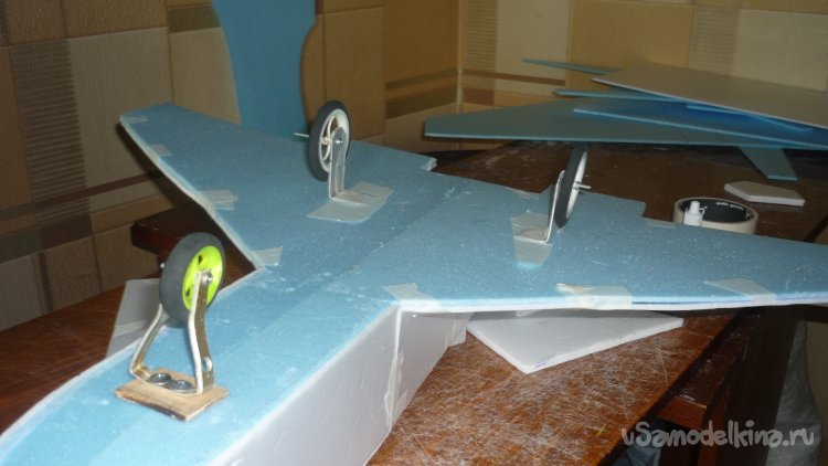 С нижней стороны модели, на крыльях и в носовой части фюзеляжа , приклеиваю кусочки фанеры , толщиной 3 мм. На них монтирую шасси. Шасси подобрал от старой авиамодели.