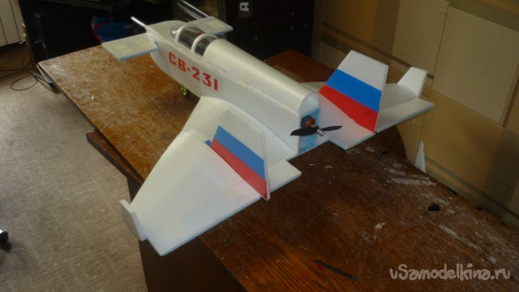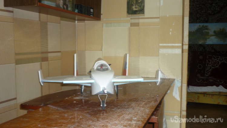 Я не буду показывать как монтируются сервомашинки на элероны и руль высоты, как вклеиваются кабанчики и подсоединяются тяги. Показываю готовую модель.
