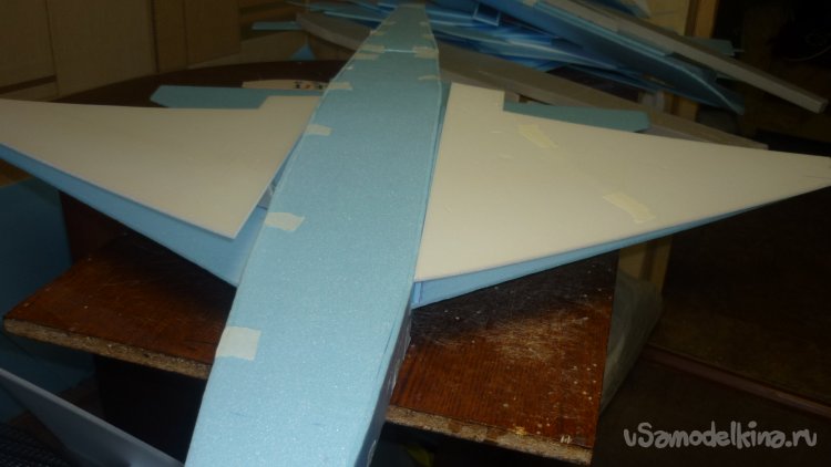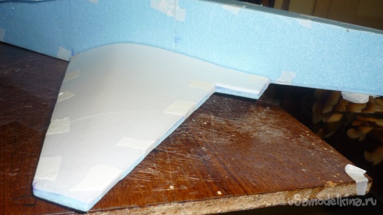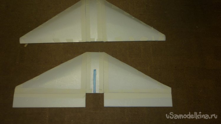 Вырезаю заготовки из подложки и потолочки и склеиваю в два слоя элероны и рули высоты.. Навешиваю их на бумажный, малярный скотч.