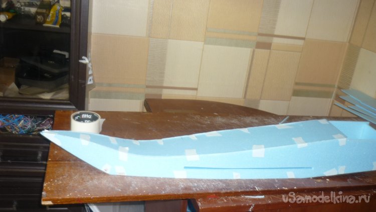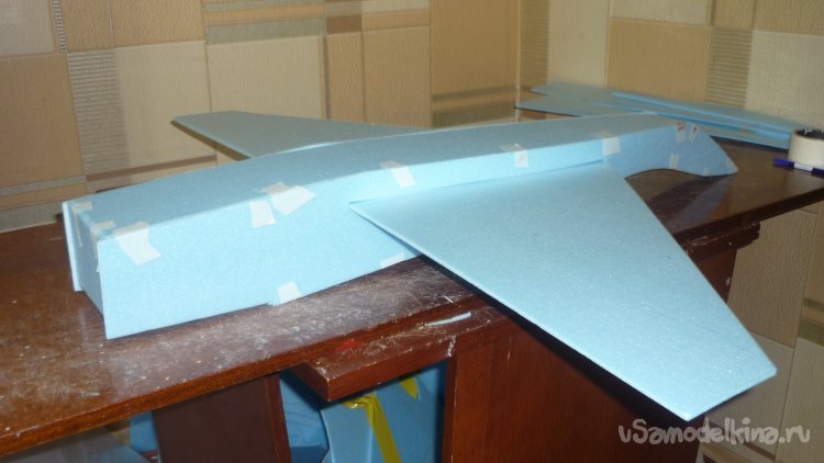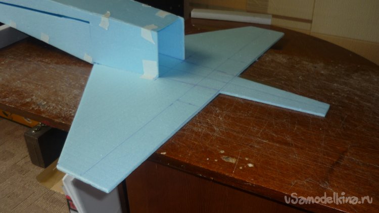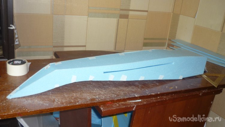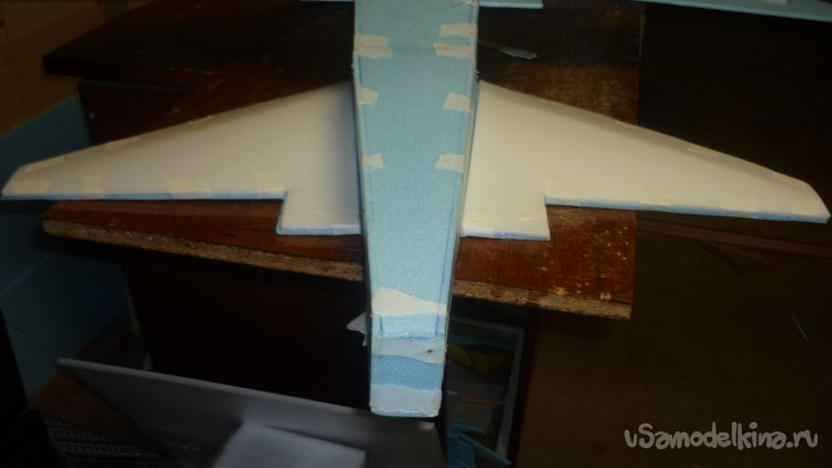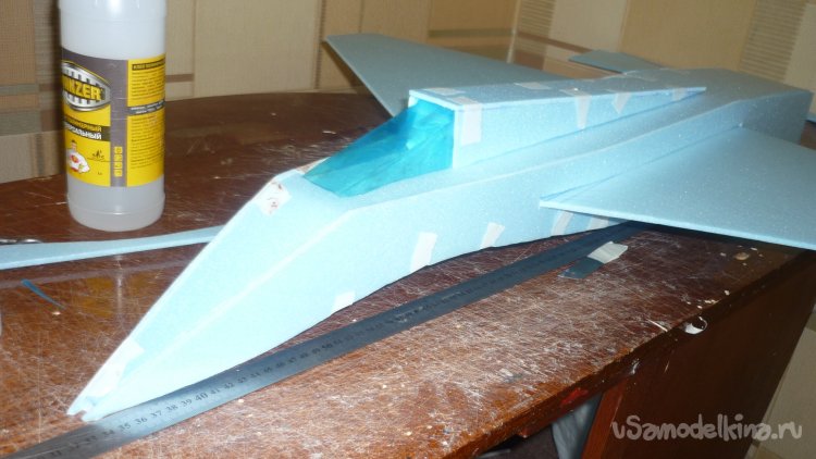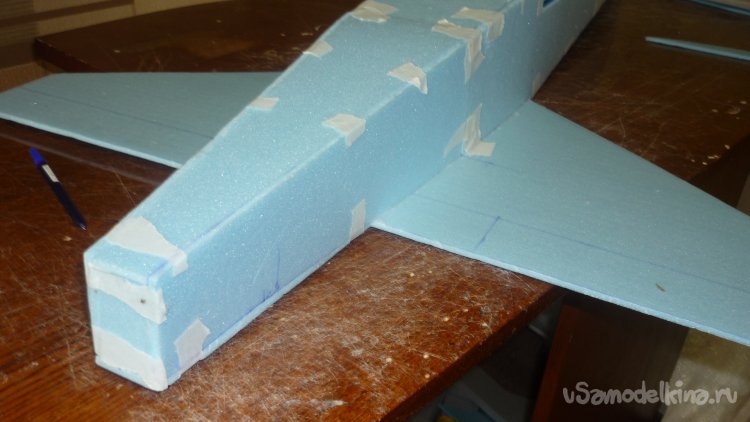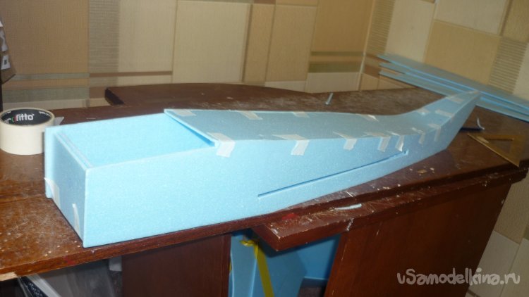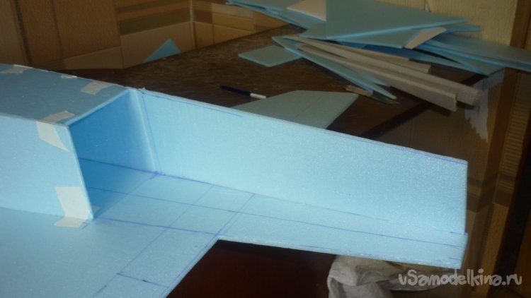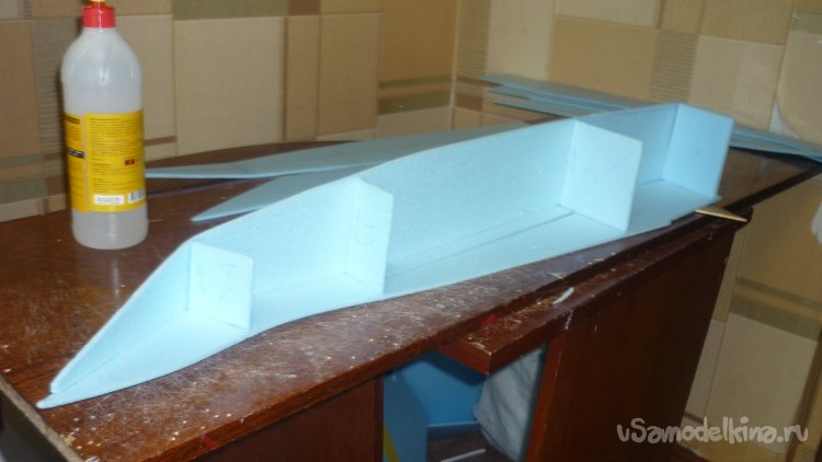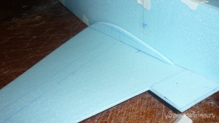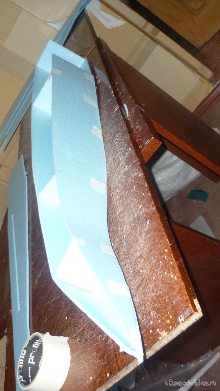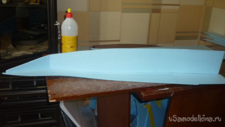 Вырезаю из утеплителя кусок, приклеиваю на него 3 мм фанеру, для последующего монтажа мотора с винтом.