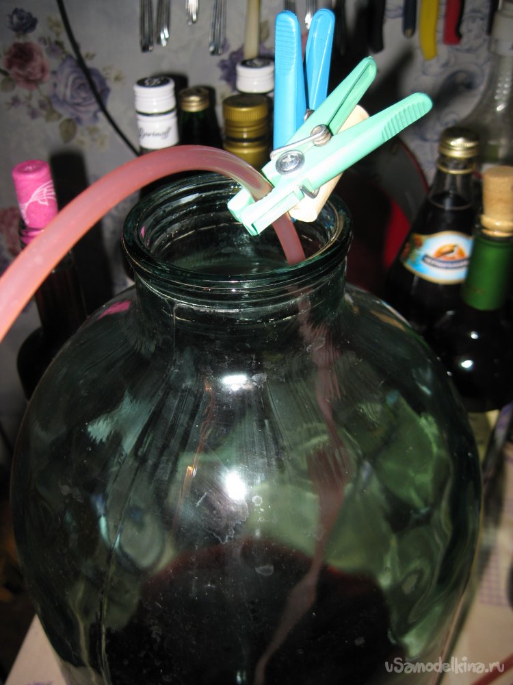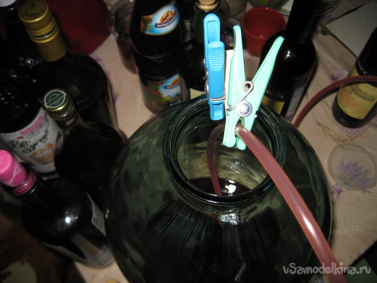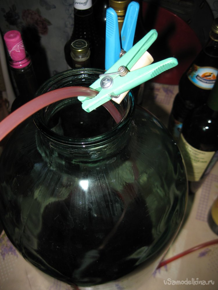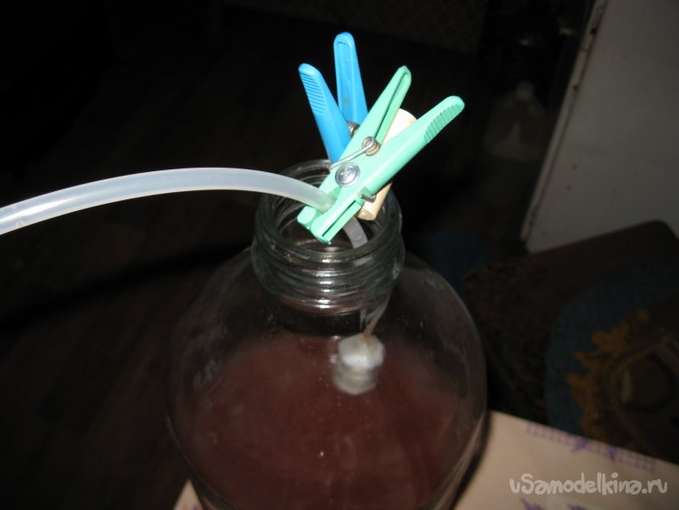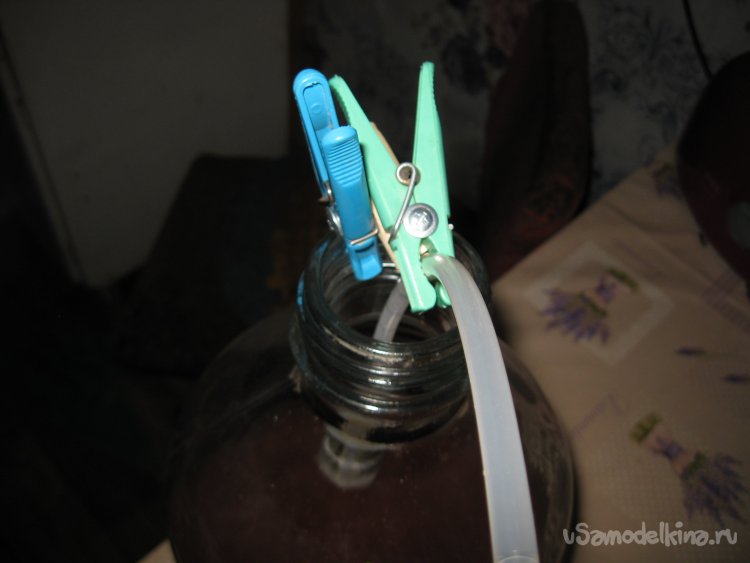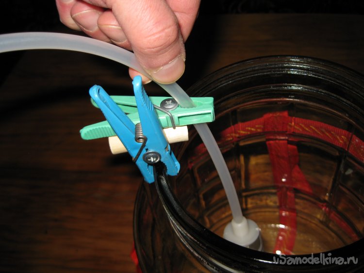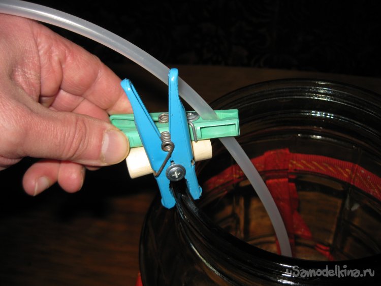 А с помощью второй прищепки, мы зажимаем пластиковую трубку для переливания вина.