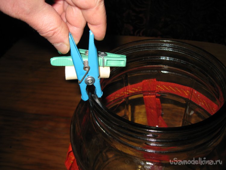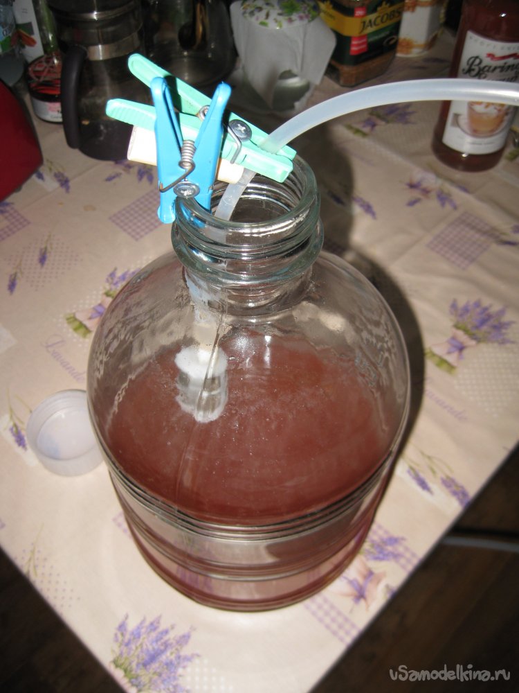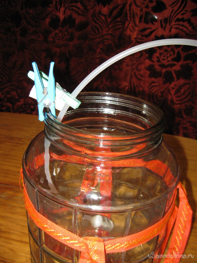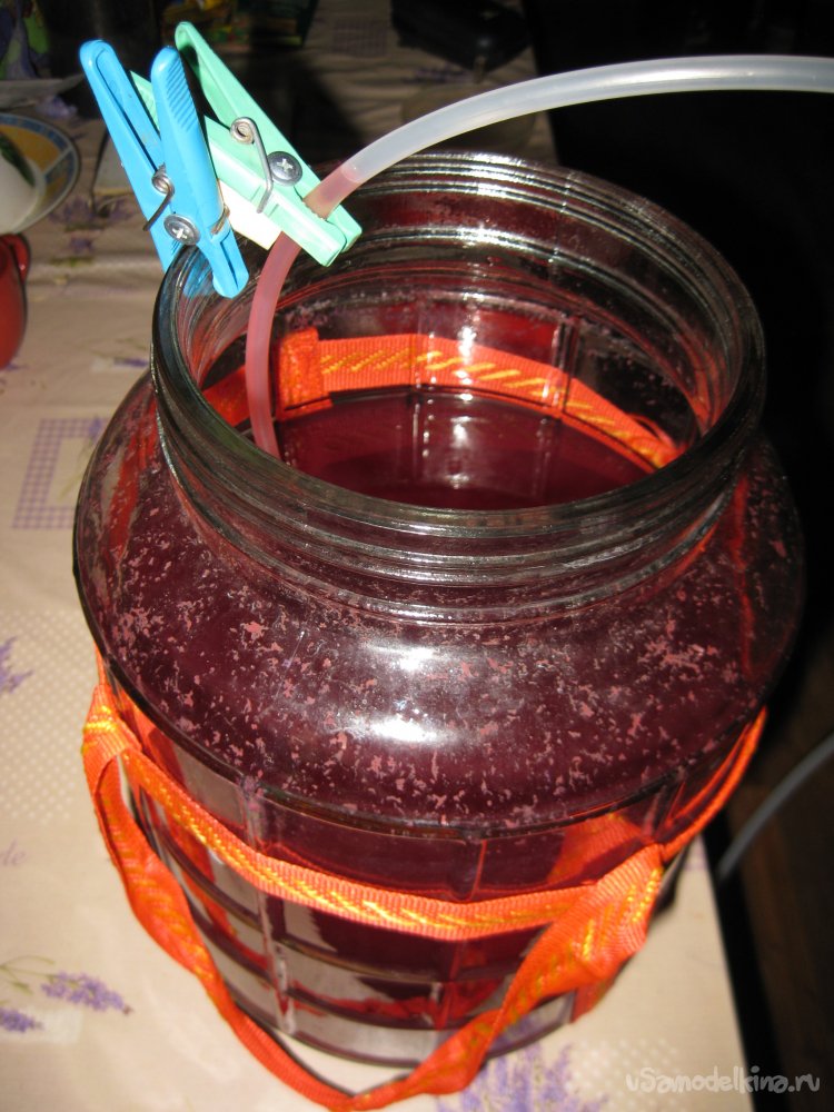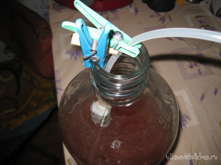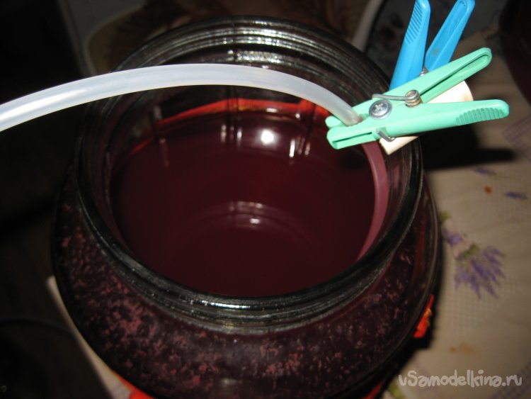 А с помощью второй прищепки, мы зажимаем пластиковую трубку для переливания вина.
