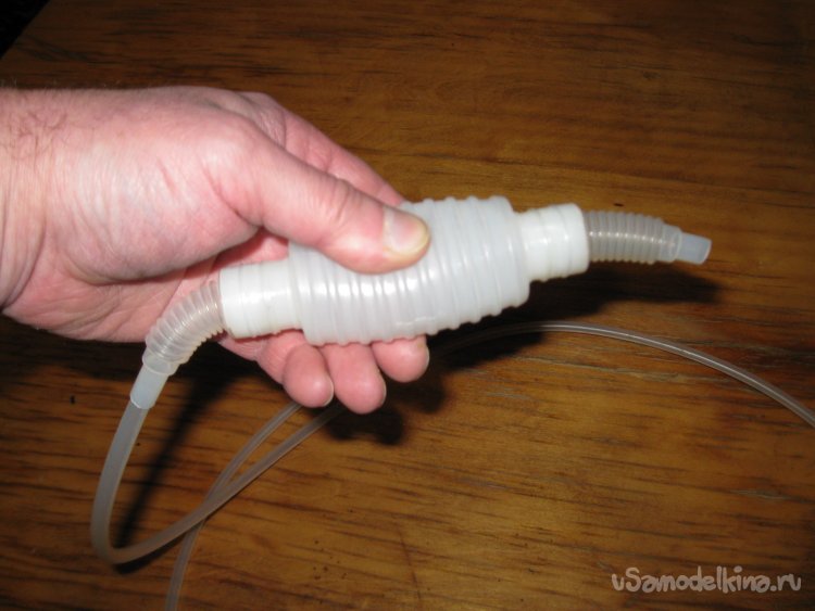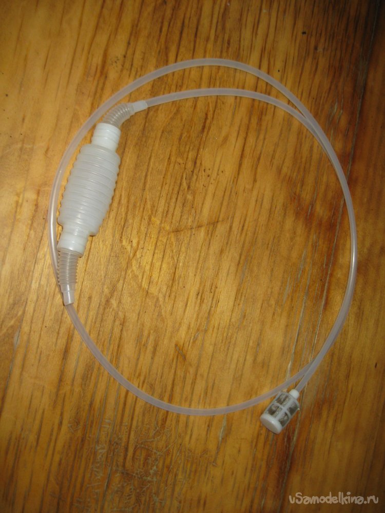 На этой трубке имеется ручная помпа, благодаря которой при переливании уже не надо всасывать вино ртом. Достаточно раза два или три сжать рукой помпу и вино можно переливать.