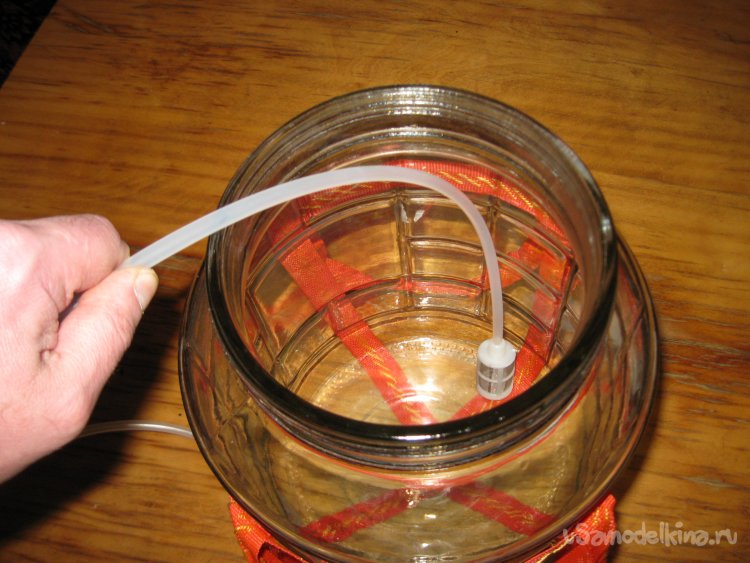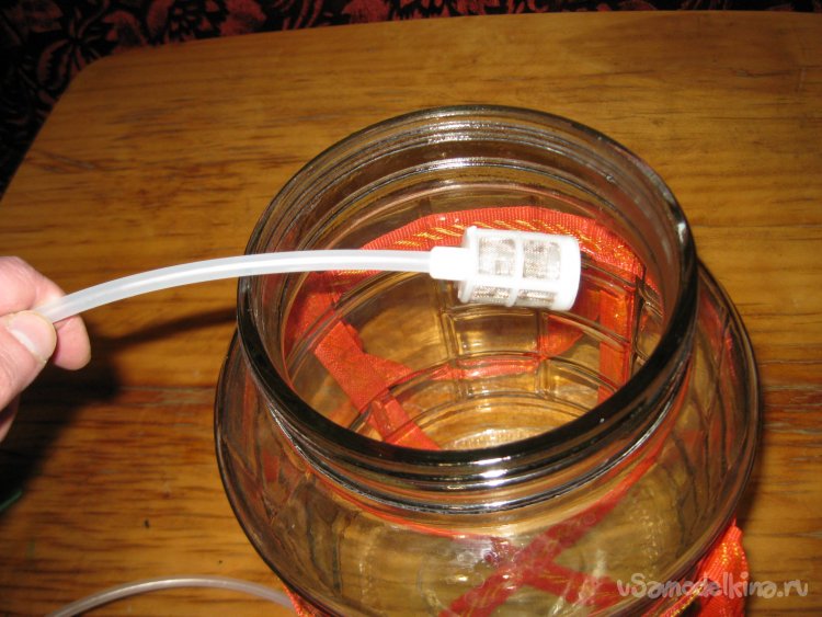 Вот на фото (на примере пустой бутыли), наглядно видно, что конец трубки опущенной в бутыль или погружается на самое дно, или вообще выскакивает из бутыли (в данном случае, я едва успел подхватить конец трубки).
