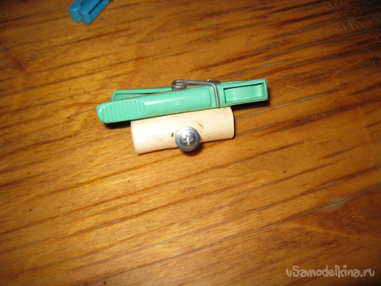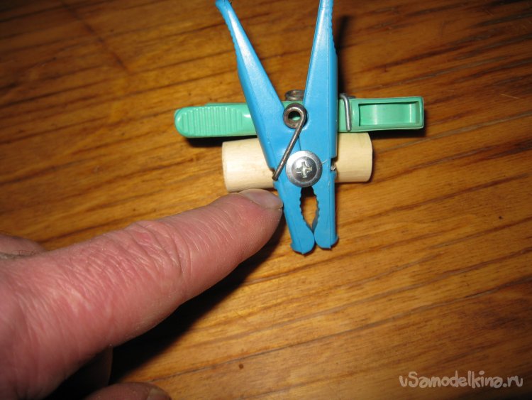 Ну, а затем, я ввернул в этот отрезок два шурупа с прессшайбой, для установки бельевых прищепок. Дело в том, что в моих прищепках, по центру имеются вот такие выемки, которые при смыкании губок прищепок, образуют отверстие диаметром сантиметров пять.
