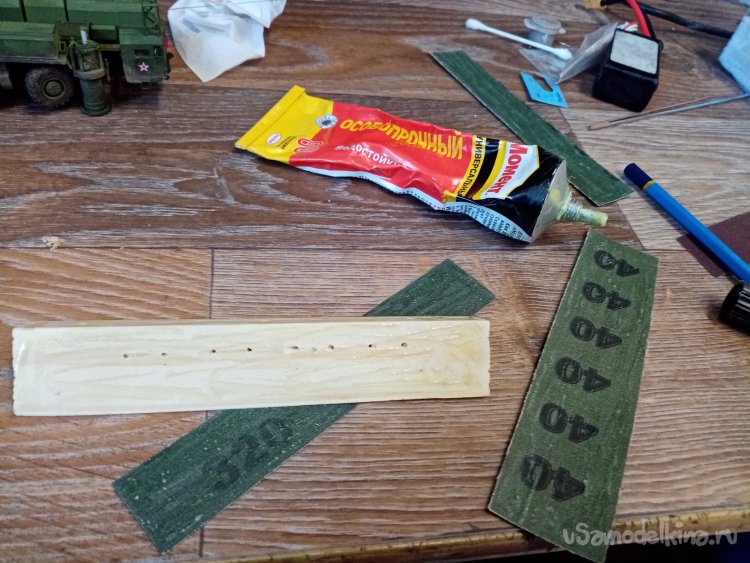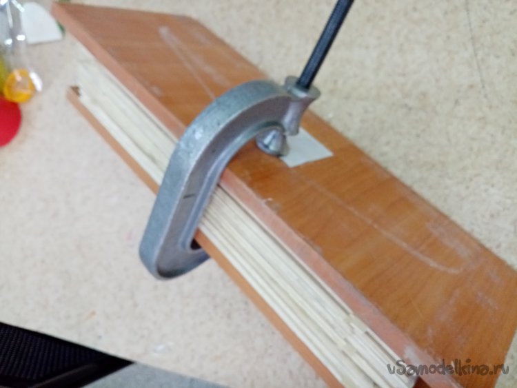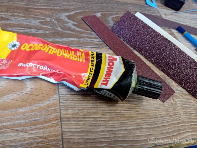 Конструкция будет разовая. Неразборная. Поэтому приклеиваю на момент. Наношу небольшое количество клея на деревяшку и шкурку. О инструкции выдерживаю некоторое время. Прижимаю детали друг к другу.