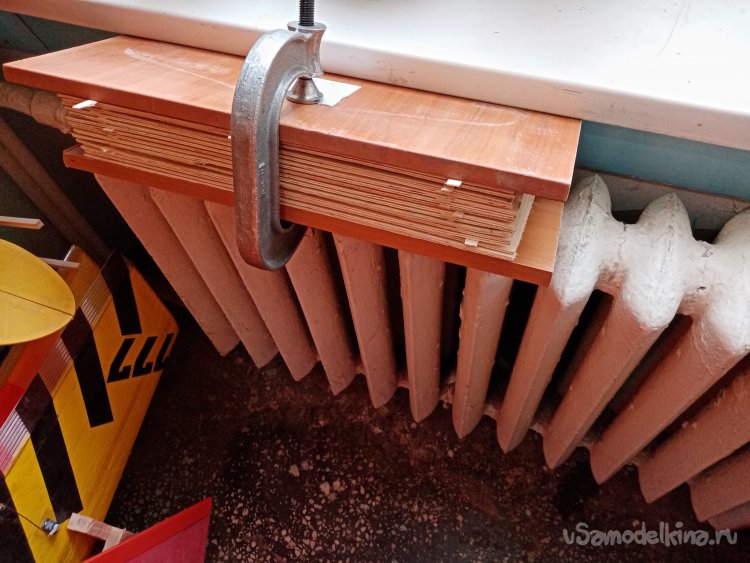 Некоторые стенки имеют кривизну. Немного брызгаю водой из цветочного пульвизатора, складываю стопкой, обкладываю сверху и с низу досками и зажав струбцинами помещаю на батарею. Зимой высохнут хорошо.