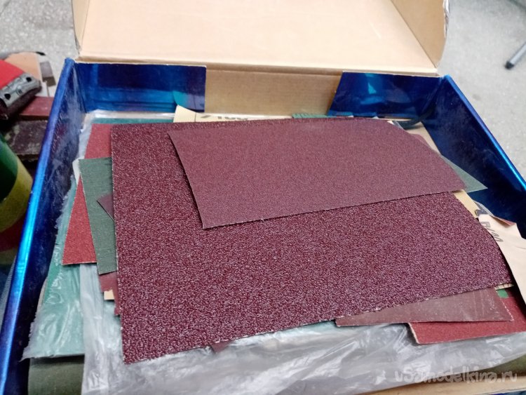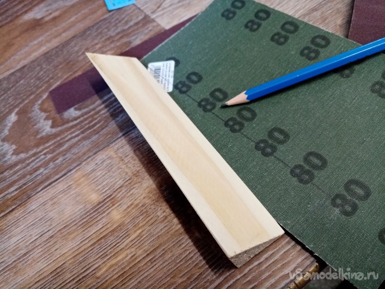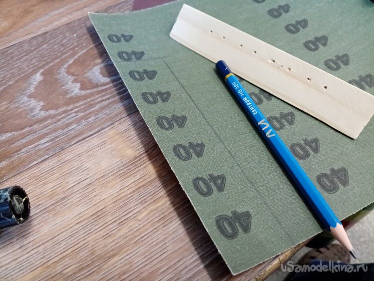 Укладываю брусочек на изнанку листа шкурки нужного номера. Размечаю карандашом. Отрезаю заготовку обычными ножницами.
