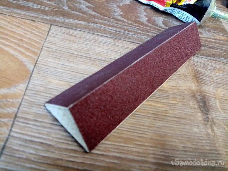 Получаются упоры для фиксации деталей фюзеляжа под углом в 90 градусов. Наклеенная шкурка защищает уголки от клея.