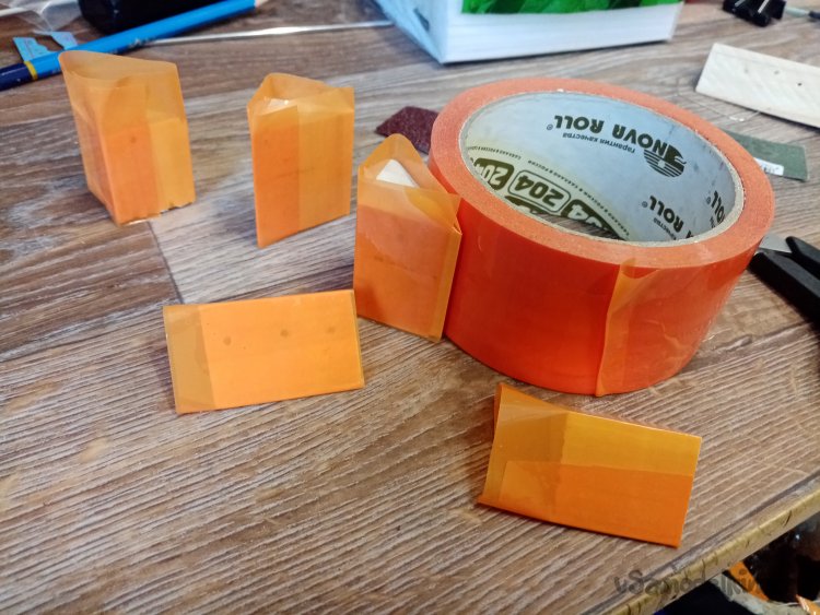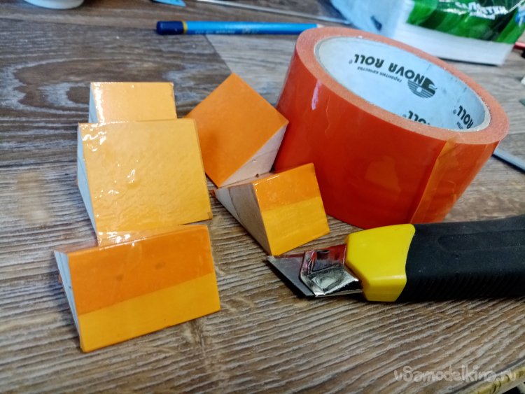 Разрезаны на более короткие части треугольные брусочки оклеиваю упаковочным скотчем.