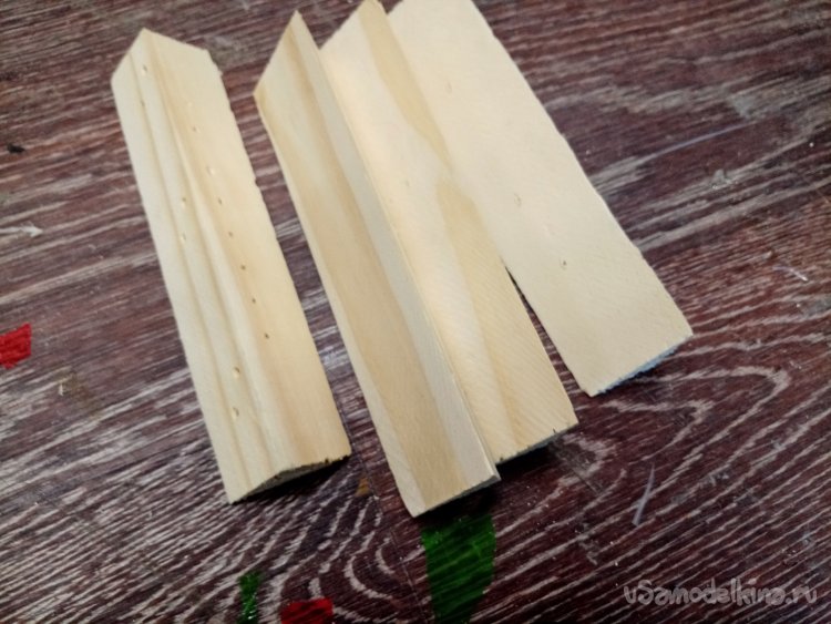 И еще вариант. Треугольные бруски тоже идут в дело. Для начала выбираю хорошие и ровные заготовки. Немного шлифую шкуркой. И распиливаю на маленькой циркулярке на детальки.