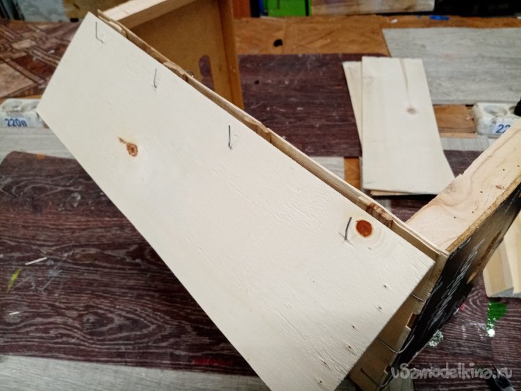 В некоторых вариантах попадаются торцевые стенки из толстой фанеры, но редко. По большей части они из прессшпана. Это не наш материал, выбрасываю.
