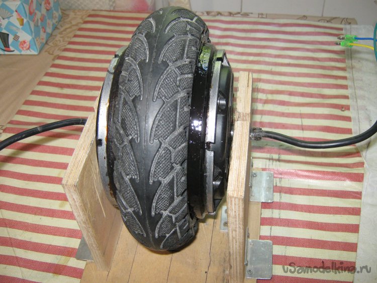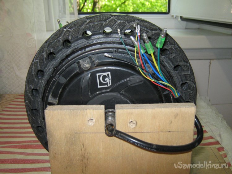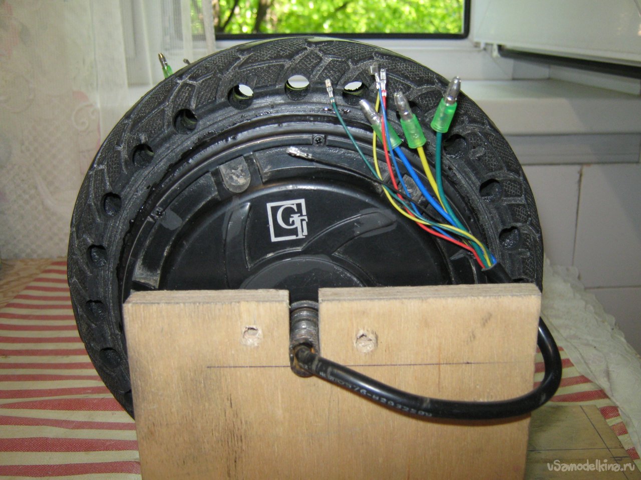 или деление квадрата напряжения на сопротивление U2:R. Для мотора мощностью 350Вт напряжением питания 36в сила тока будет 9,722А I=P:U (350 Вт : 36 В =9,722 А Находим сопротивление одного нашего стандартного мотор-колеса : R=U:I ( 36В : 9,722А = 3,702 Ом) Запомним эту цифру 3,702 Ома. Теперь посмотрим какой будет ток при питании от 48В. I=U:R (48 В : 3,702 Ом= 12,9659 А) А теперь посмотрим мощность мотора при питании 48 В и токе через него 12,9659 А ( P= UI 48В Х 12,9659А = 622,366 Вт) Ну и поскольку мотор-то у нас сдвоенный , то получается 622,366 Х 2 = 1244,732 Вт. Как с куста! И еще. Сам того не подозревая, после изготавления я обнаружил массу преимуществ данного изделия перед обычным мощным мотором. Ну например: для него не нужен дорогостоящий мощный контроллер ценой от 3000 и выше, можно взять два обычных на 350 Вт по цене 950р за штуку, имеются две независимые платы с Датчиками Холла. и например при выходе из строя одной платы можно без разборки и ремонта оперативно подключить вторую. то есть есть резерв. И самое главное. Можно регулируемым подключением второй половины двигателя добиться когда нужно экономии когда нужно максимальной мощности. Например: хочешь ехать далеко -включена одна половина, необходимо подняться в крутую горку , нажимаешь кнопочку, срабатывает трехфазное реле-квакушка, подключается вторая половина и прешь в любую горку на зависть тем у кого стоит даже 500 ватный движок.