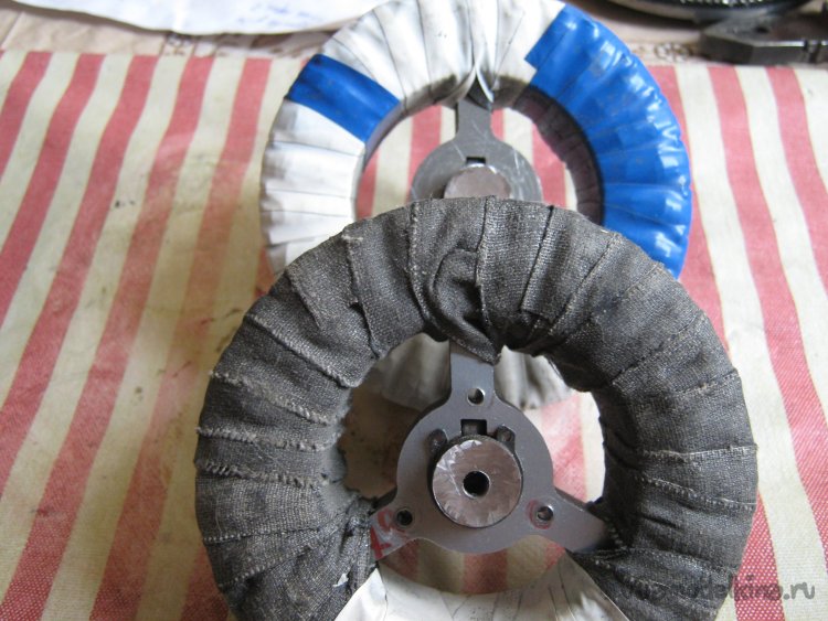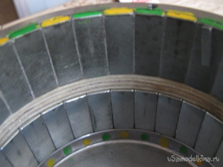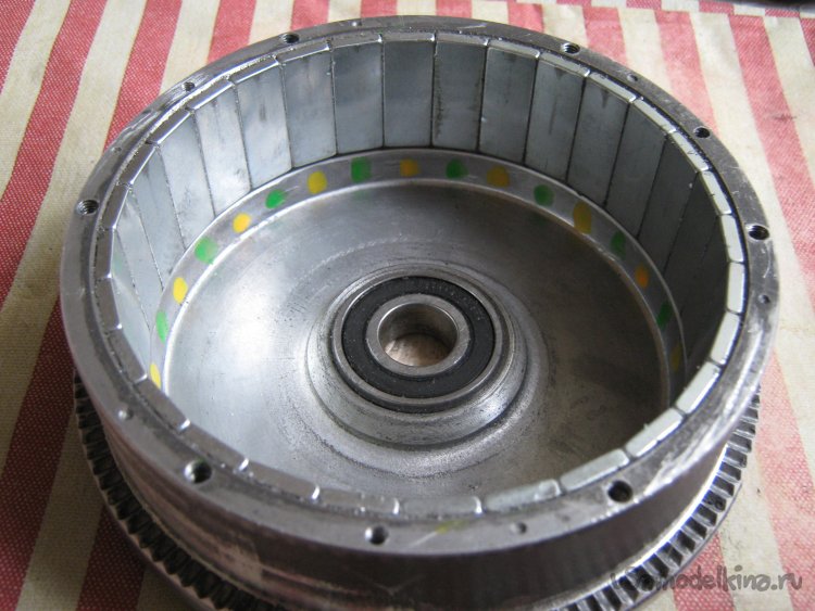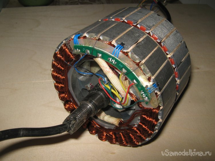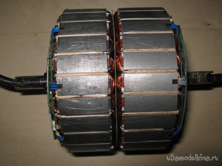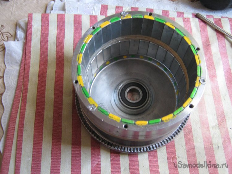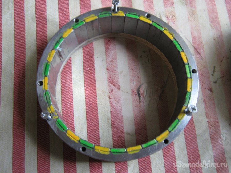 вала и перемотки обмоток избежать? Оказывается можно! Но не спешите радоваться, все равно потребуется размеренность и большая аккуратность. Итак: на авито приобрел два много походивших ,но с целыми обмотками и убитыми Холлами стандартных мотора 36в 350вт по символической цене 1000р за пару. Холлы в дальнейшем заменил,конечно. Далее разбираюся оба двигателя, оставляются оба статора, два кольца ротора с магнитами и две крышки. Еще две крышки не понадобятся. Приступаем к самому процессу изготавления. Обматываем изоляционной лентой обмотки на обоих статорах во избежание их повреждения при дальнейших действиях. Отпиливаем с помощью шлифовальной машинки с отрезным кругом валы со стороны где нет продольного отверстия для фазных проводов и проводов датчиков так, чтобы отрезанная поверхность была вровень ( а лучше ниже на 0,5 мм) с линейкой положенной на обмотки. Данная операция проделывается на обоих статорах. Далее, с помощью керна намечается центр для сверления "глухого" отверстия. Можно и даже лучше,конечно, проверлить на токарном станке, но у меня такового ,к сожалению нет. Пришлось задействовать верный глаз и твердую руку. Обращаю внимание, что точность исполнения данной операции предотвратит нарушение соосности в дальнейшем. Сверлится отверстие диаметром 5,4 ,глубиной 15-20 мм. Далее нарезается внутренняя резьба М6. Данная операция проводится на обоих статорах. В отверстие одного статора вкручивается шпилька М6, так чтобы снаружи оставалась ее часть длиной 15-18 мм. Шпилька вкручивается только в один статор - второй приемный! Стыкуем оба статора навинчивая один на другой. Здесь надо добиться того, чтобы пазы для датчиков Холла находились на одной линии друг к другу, но одновременно отрезанные концы валов плотно упирались друг в друга. Для этого советую между концами валов подкладывать тонкие металлические! шайбы. Добившись того, что валы плотно уперлись друг в друга, а зубья магнитопровода с пазами датчиков находятся на одной линии сверлим удлиненным сверлом три сквозных отверстия диаметром 3 мм в магнитопроводе обоих статоров. В них будут вставляться три длинных винта и самоконтрующиеся гайки для окончательной фиксации статоров относительно друг друга. Далее разбираем статоры. Снимаем защитную изоленту и собираем снова не забывая проложить между обмотками двух статоров изоляционную круглую гладкую пластину. Можно фторопласт, стеклотекстолит или на крайняк плотную бумагу. Скрепляем оба статора длинными винтами с самоконтрующимися гайками. Уф! Со статором разобрались! Приступаем к ротору. Обращаю внимание, что на фото хорошо видно, что магниты внутри колец роторов помечены зеленой и желтой краской. ВАЖНО, чтобы магниты одной полярности были рядом друг с другом! Чтобы крепко соединить их между собой придется в одном кольце просверлить три сквозных ,а в другом три глухих отверстия. Здесь важно добиться того, чтобы одно кольцо было как продолжением второго. Для этого берется червячный широкий хомут диаметром 120 мм. Одно кольцо ставится на второе и скрепляется затягиванием хомута. Затем сверлом 2,5 мм делаются три ( можно и больше, но это кажется лишняя работа) отверстия. В одном кольце три сквозных, в другом три глухих на глубину 15-20 мм. Далее в том кольце где отверстия сквозные рассверливаем их сверлом 3 мм. А в кольце где отверстия глу
