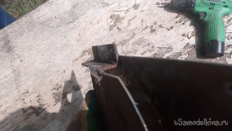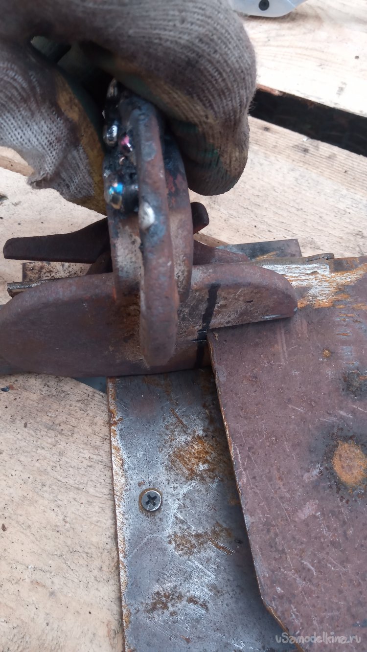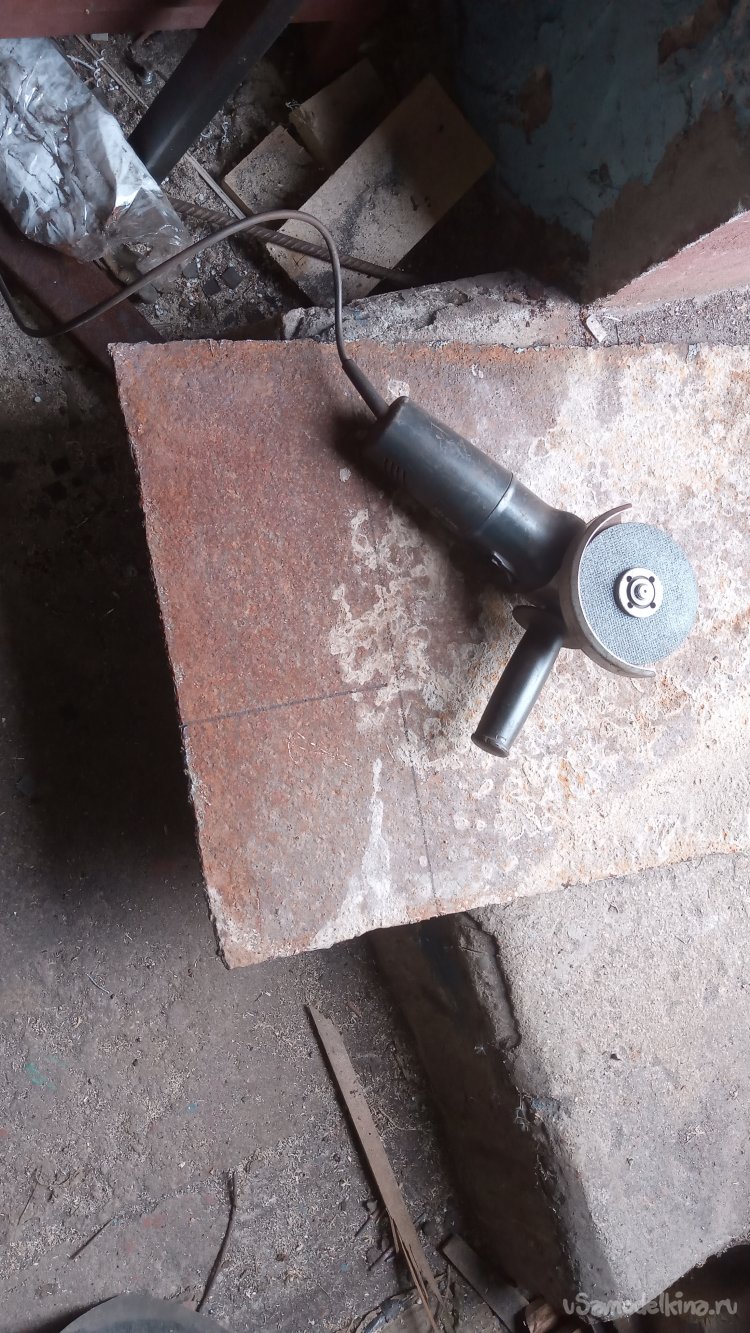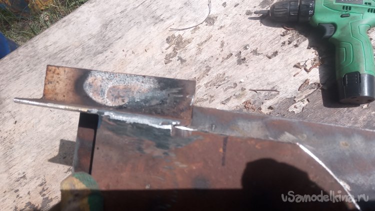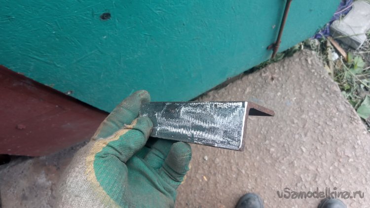 !25-я болгарка не достала. Пришлось зачищать прихватки 180-й))))Приварил в качестве упора обрезок 32-го уголка: