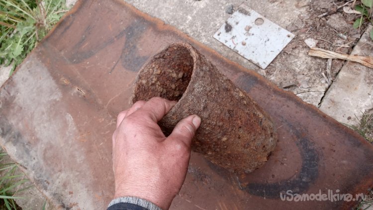 Начал с подбора трубы достаточного диаметра. Решил использовать трубу, найденную в земле, когда копал котлован под фундамент пристройки дома. Вот такой вот кусок трубы я откопал на глубине более метра: