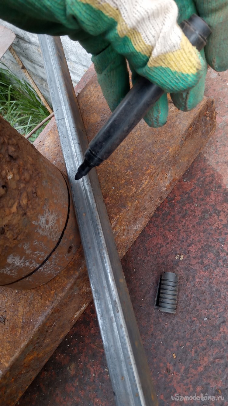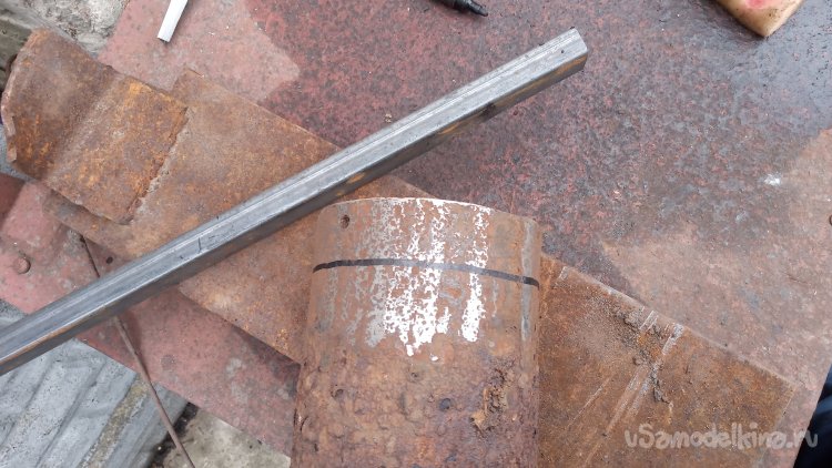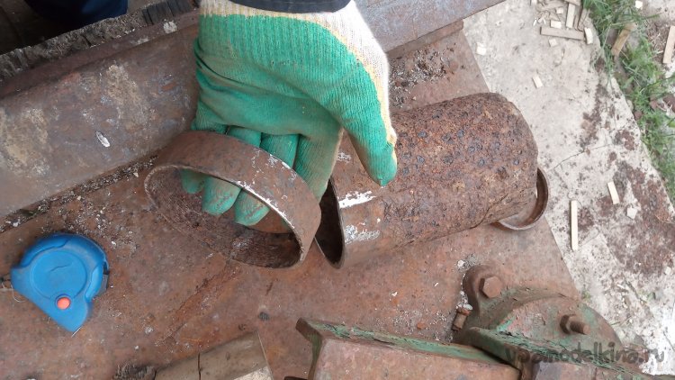 Труба стальная, не чугун. Толстостенная! Даже, не смотря на очень сильную коррозию, стенки остаются достаточно крепкими. Счистив лепестковым кругом рыхлую ржавчину, отметил кольцо, шириной 30 миллиметров. Так как один край был ровным, явно станочной обрезки, то разметку я решил сделать "прикладным методом" - просто приложил трубу того размера, который хочу гнуть, и по ней очертил маркером: