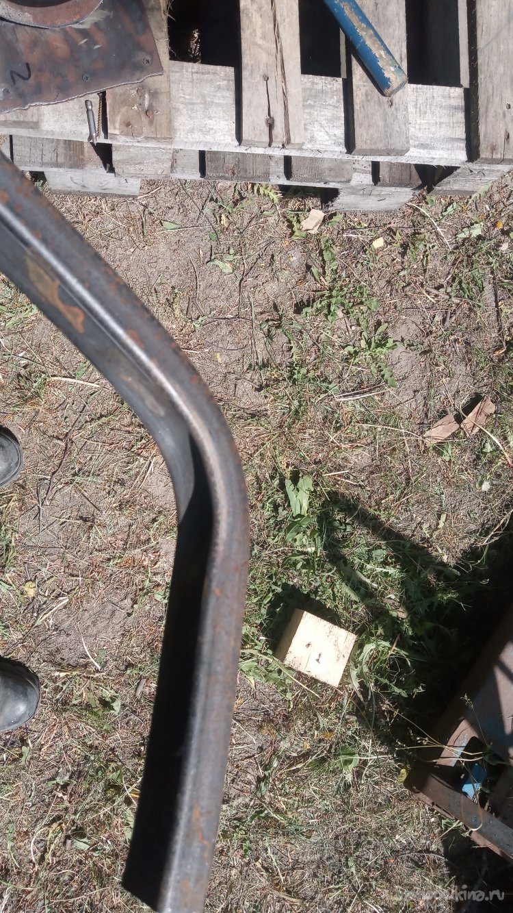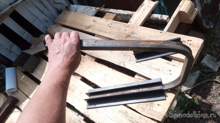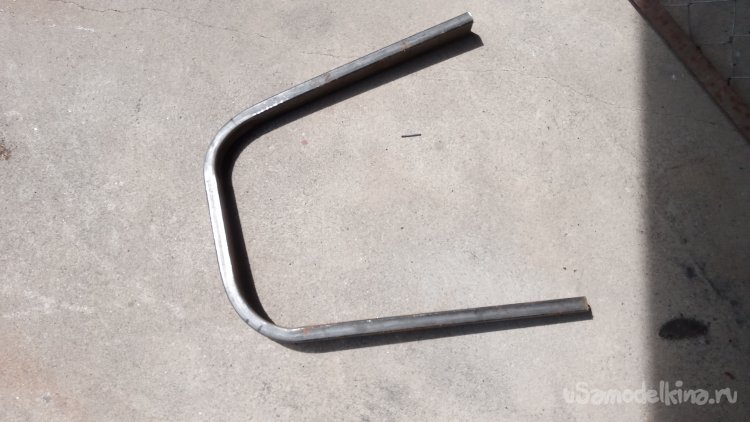 А сейчас мне нужно сделать не одну, а три скамейки. Поэтому я решил отказаться от такого проекта скамейки, а придумать какой-нибудь более простой, подразумевающий менее трудоёмкий способ изготовления. Такой способ подразумевал наличие какого-то шаблона, который позволит профильную трубу согнуть с небольшим радиусом закругления на угол, близкий к прямому. И, конечно-же, сделать это надо так, чтобы она не смялась, и её поперечное сечение не приобрело форму параллелограмма. Первого можно достичь, если сгибать трубу вокруг шаблона достаточного диаметра. Но вот, второе при этом возникает обязательно!