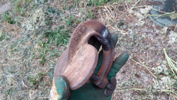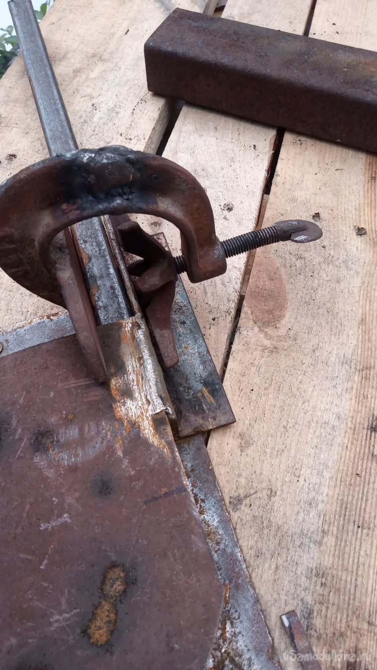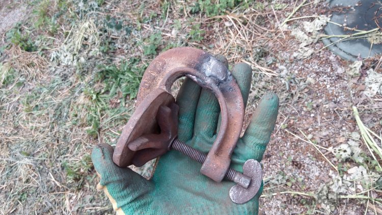 Во-первых, снабдить приспособу более надёжной струбциной. Во время испытаний я пользовался универсальной раздвижной. Но она и не особо удобна в данном случае и, главное, недостаточно жёсткая. Деформировалась, потому что усилие в данном случае направлено на сдвиг заготовок, а у неё узкие губки. Вспомнил о том, что у меня валяется подобранный где-то старый, ещё советский вулканизатор. Точнее, только струбцина от него (банка, в которую бензин наливался, утеряна). Когда я его подобрал, он был очень сильно заржавевшим. Да так и остался лежать. Нашёл, облил "ВД-40", подождал. Попробовал разработать резьбу. Крутить пришлось трубным ключом....