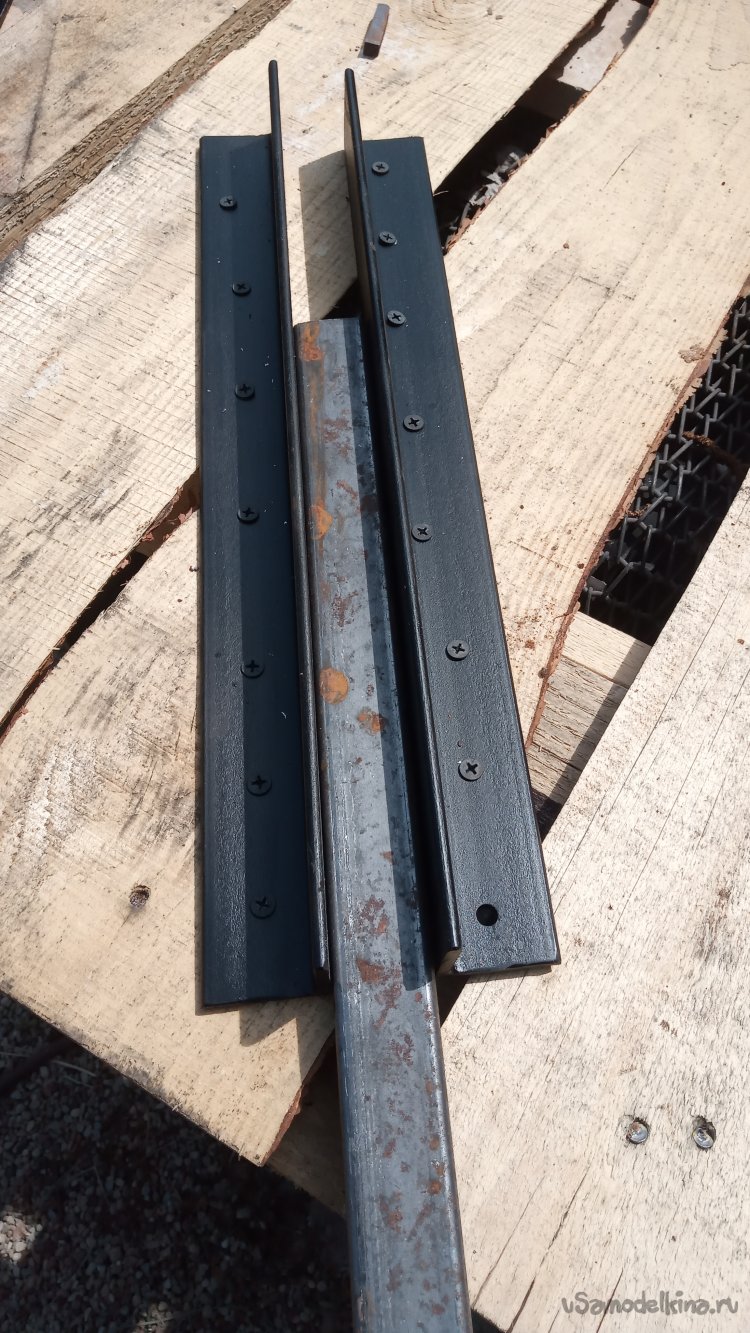 Для решения этих проблем я решил доукомплектовать приспособу двумя упорами из уголка, зафиксировав в которых нужный край изделия, я смогу вручную подогнуть его более точно. Одну пару отрезков уголка я прикрутил к столу так, чтобы заготовка плотно вставлялась между ними на ребро, вторую - чтобы вставлялась плашмя: