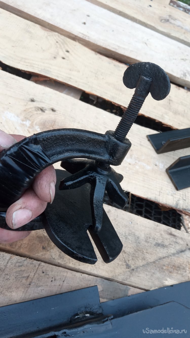 Чтобы широкая "подошва" струбцины упиралась в трубу как можно большей площадью , тем самым не позволяя ей проскальзывать, решил её не обрезать, а сделать в ней прорезь
