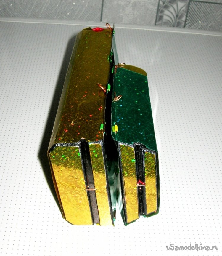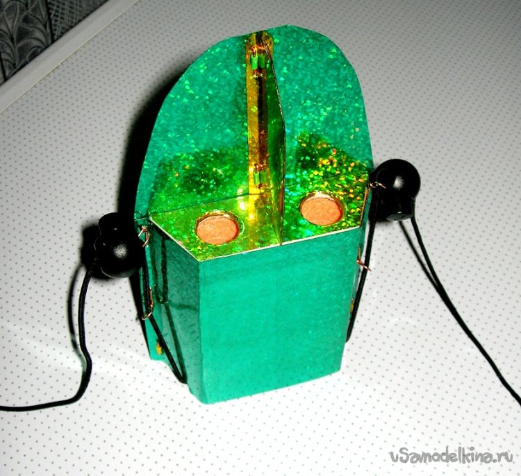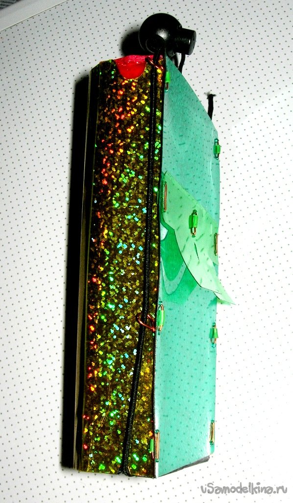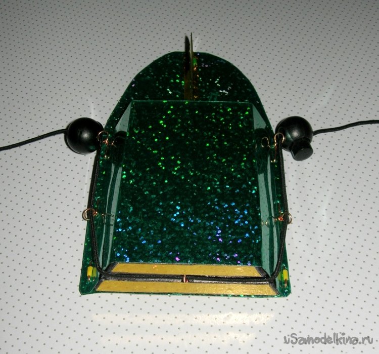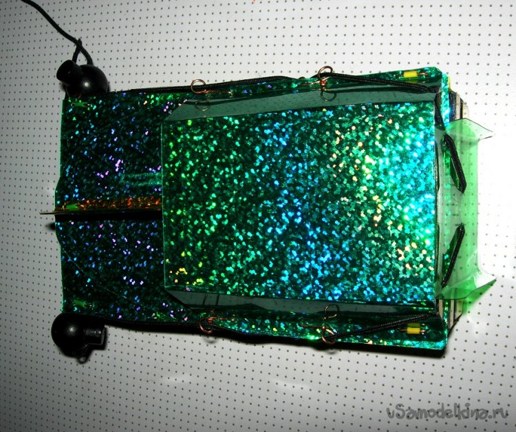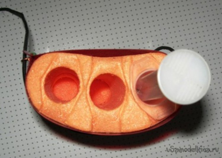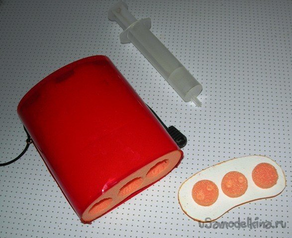 По основной части делаем днище. Намечаем места гнезд на днище и приклеиваем пробочки так, чтобы нормально входили все сразу. Клей БФ-2 или супер (если материал выдерживает - любой водостойкий). Пробочки делаем такой высоты, чтобы при закрытом днище носик шприца упирался в саму пробку или в небольшую лунку в ней (чтобы тесто не вытекало). Берем две заготовки пленки от скоросшивателя или от пластиковой бутылки и соединяем их края скрепками из медной проволоки. Нижние и верхние скрепки делаем с колечками. Еще колечко делаем в днище снаружи. Нетолстую резинку пропускаем сначала в колечко днища и нижние, немного натягиваем и завязываем на верхних колечках. Теперь днище не упадет, но его можно будет открыть для мытья. Оставшимися концами резинки (длину подбираем заранее) завязываем на ноге или вешаем на шею. Вот так – просто и удобно.