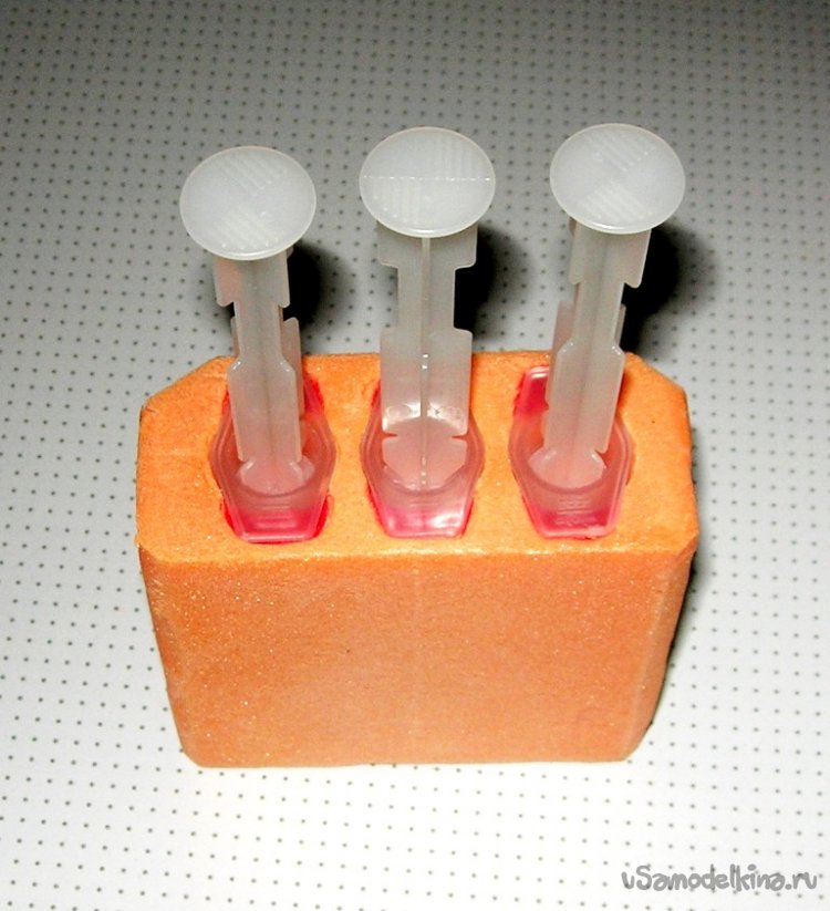 Состоит «кобура» из основной части, днища и наружной пленки (для защиты от повреждений). Сначала основную часть прикинул по высоте (длиннее шприца на 0,5-1,5 см, зависит от материала днища) и по толщине (диаметр шприца, плюс толщина каждой стенки 1-1,5 см). Ширина в зависимости от количества гнезд (в данном случае 3 диаметра шприца плюс две по 1,5 см стенки, плюс две по 1см перегородки). Вырезаем заготовку из пеноплекса (или что есть под рукой). Наметив места для гнезд, сначала прокалываем насквозь длинной спицей для центровки. Делать же отверстия в неплотном пенопласте/пеноплексе лучше острозаточенной трубочкой (например, охотничьей гильзой 12 калибра с отверстием 5-10 мм вместо капсуля для выталкивания "вырезки"). При этом, стоит сначала вырезать цилиндрик длинной 2-3 см и проколоть максимально точно по оси. Вставляем этот центрирующий цилиндрик в гильзу, одеваем на выступающую часть спицы и вкручиваем гильзу на 4-5 см с обоих сторон заготовки, после чего цилиндрик вынимаем и дорезаем отверстие на всю длину. Сверху сделал еще вырезы под упоры шприца.