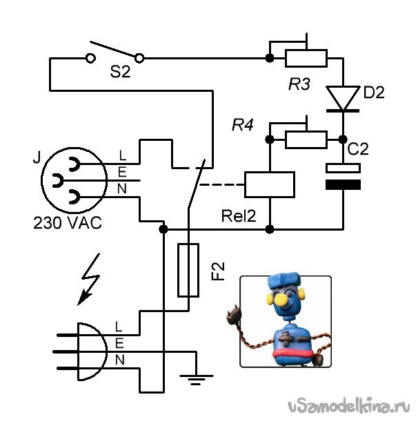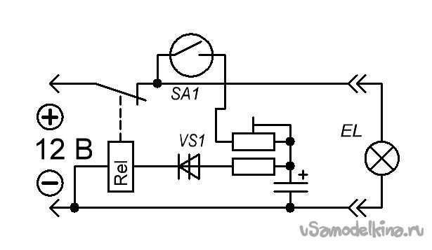 При подаче питания через НЗ контакты реле происходит зарядка конденсатора до напряжения срабатывания реле, скорость зарядки задается верхним по схеме подстроечником, и, ес-но, емкостью конденсатора. Контактная группа переключается, напряжение подается на нагрузку, а конденсатор не спеша разряжается через обмотку реле и нижний по схеме подстроечник до напряжения отпускания. Все, цикл повторяется. Конденсатор 1000,0*16 В, резисторы около 1 кОм.