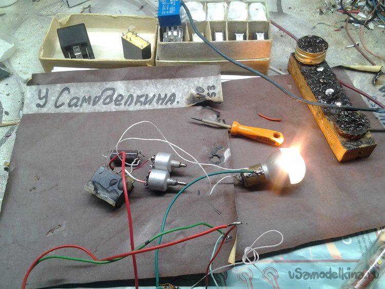 Попросил меня дальний родственник, работающий бригадиром электриков в небольшой фирмочке, помочь ввести режим мигающей световой индикации (или прерывистого звукового сигнала) при включении чего-то там в их технике. Недолго думая, я вытащил и предложил ему примерно кило...полтора разного электронного хлама. Нет, сказал Леша, наш ГИ - человек старой закалки, релейную автоматику он, конечно, понимает, и, к тому же, надо, чтобы было сделано из их деталей и их пацаны могли, чуть что, сами отремонтировать. Слепить на макетке схемку из полдесятка деталей недолго, тем более что пива уже оставалось немного.
