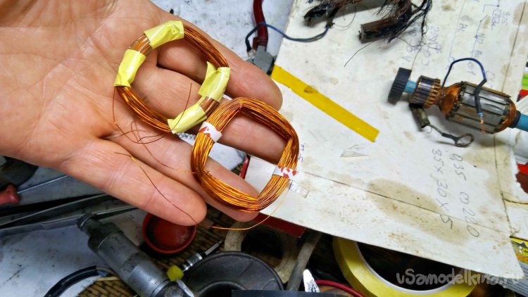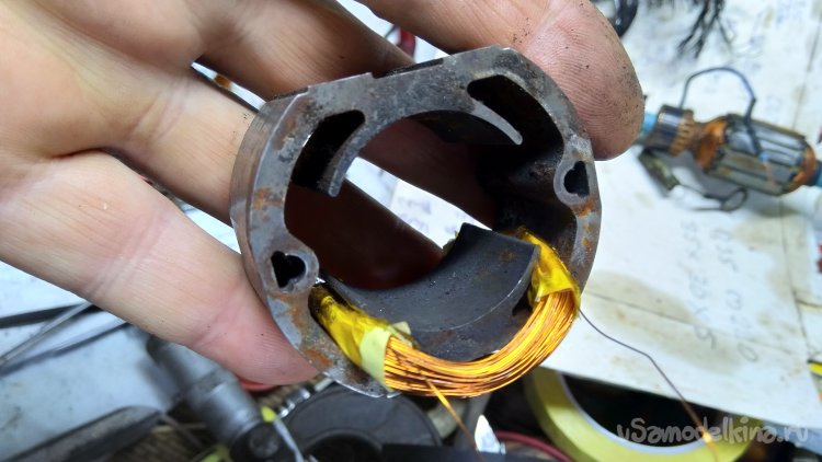 Но для меня особой проблемы перемотать обмотки не представляет сложности. Выпилил шаблон по размеру старой обмотки, подсчитал витки, замерил диаметр провода, и минут за 10 намотал обе обмотки. Уложил в пазы магнитопровода и собрал болгарку.