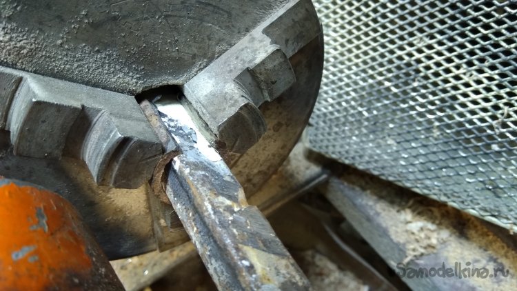 И я ведь поначалу пару десятков сайтов с инструментами пересмотрел, нет таких. Ну и ладно, я и сам могу сделать. Квадратный пруток на 14 мм отковал до нужного мне размера, затем на токарном станке проточил хвостовик. Для того чтобы зажать квадрат в трёхкулачковый патрон, отпилил кусок трубы и разрезал его вдоль. Внутрь вставил квадратный пруток и уже через трубу зажал в патроне. При этом квадратный пруток самоцентрируется в оправке.