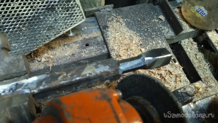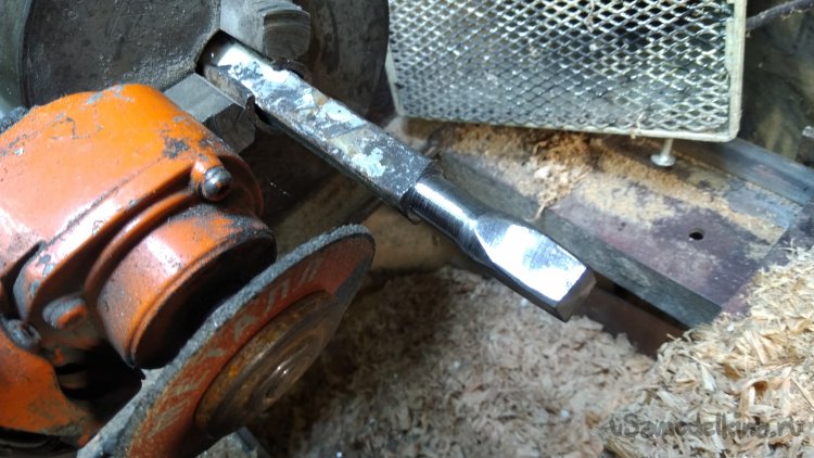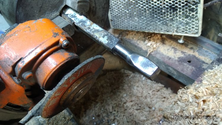 Шестигранник проточил углошлифовальной машинкой (болгаркой) закреплённой в резцедержателе. У меня на патроне градусная сетка, поэтому с делением ничего придумывать не надо, патрон поворачивается на нужный угол, суппорт с закреплённой в резцедержателе УШМ подводится поперечной подачей, и продольной подачей при включенной УШМ делается шлифовка граней. Грани получаются вогнутые, не плоские ввиду того, что диск перпендикулярно к обрабатываемой поверхности, но для моих целей этого достаточно, после шлифовки слегка проковывается и грани становятся такие как надо.