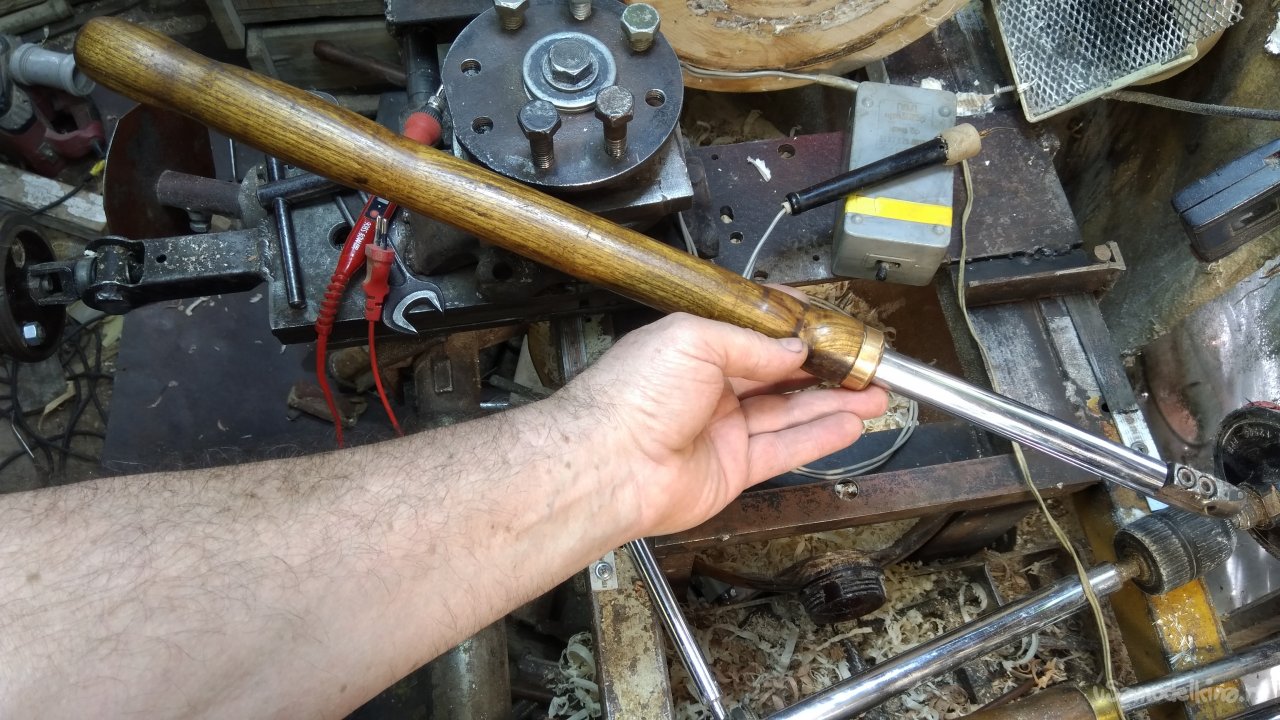 хотелось украсить её. Решил пару полосок нанести проволокой, но чуть не испортил. Сосна слишком мягкие промежутки имеет между годовыми кольцами, поэтому, когда я прижал проволоку к вращающейся заготовке, для того чтобы прижечь полоски, вместо того чтобы прижечь и оставить след, проволока стала резать сосну, причем проволока ещё и перескакивала по годовым кольцам съезжая в разные стороны.