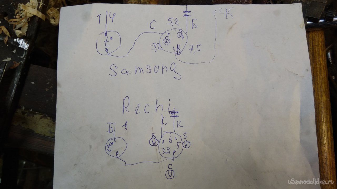 Сначала я нарисовал схему подключения на одном и на втором компрессоре. Провода разные по цвету, но и расположение выводов другое, пришлось омметром прозванивать и искать рабочую обмотку, пусковую обмотку и точку их соединения, они ведь включены последовательно, но пусковая через конденсатор, а средняя точка через термопредохранитель. Наконец я допёр что к чему подключить.