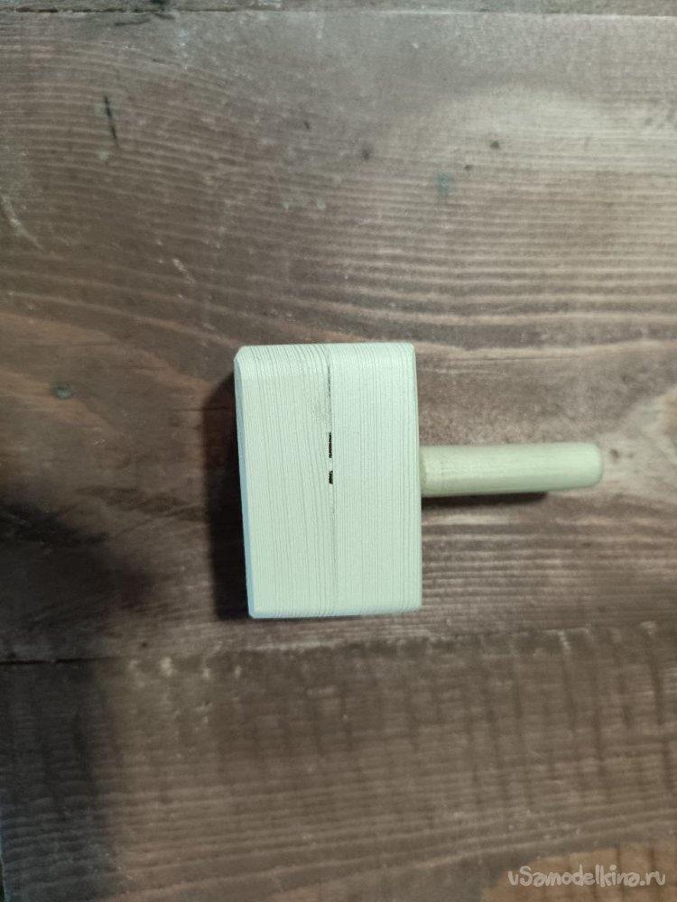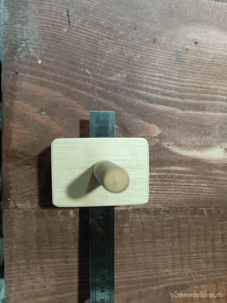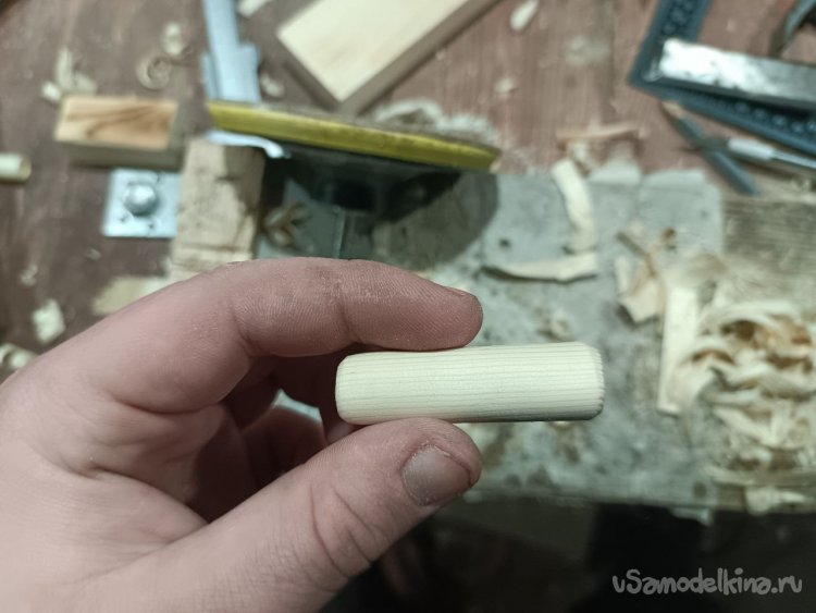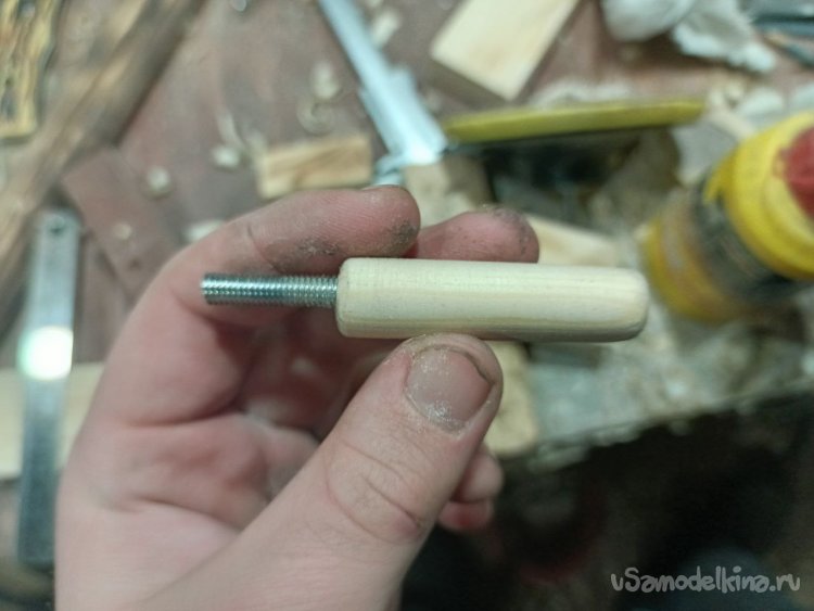 Сначала просверлил отверстие в деревяшке, закрутил в отверстие болт, а дальше в шуруповерте, наждачной бумагой, придал форму цилиндра.