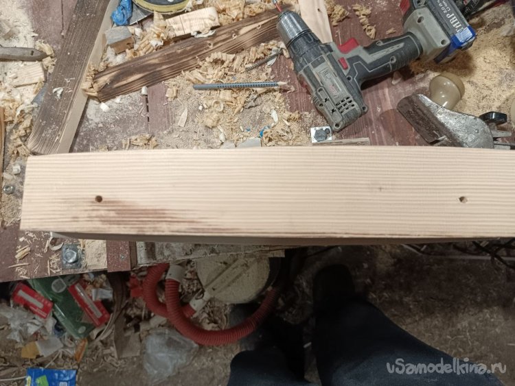 Так как доску я пилил из пенька, получилась она кривая, с разной толщиной по краям, но для полки это даже на руку, будет выглядеть по компактнее.