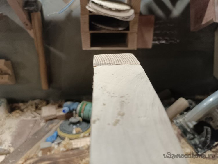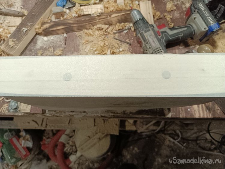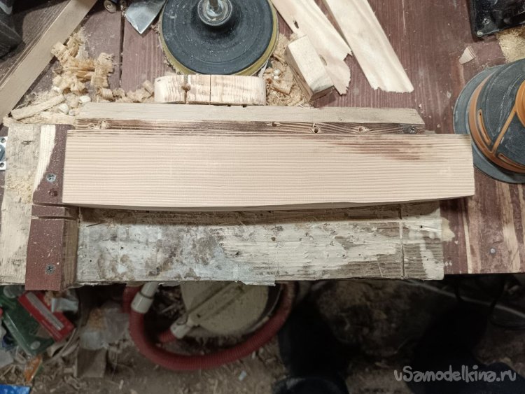 Верхнюю часть полки, на которую будут ставится предметы, я решил обработать полукруглой стамеской, чтобы получить вот такую фактуру.