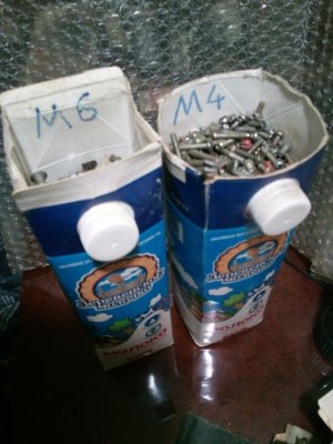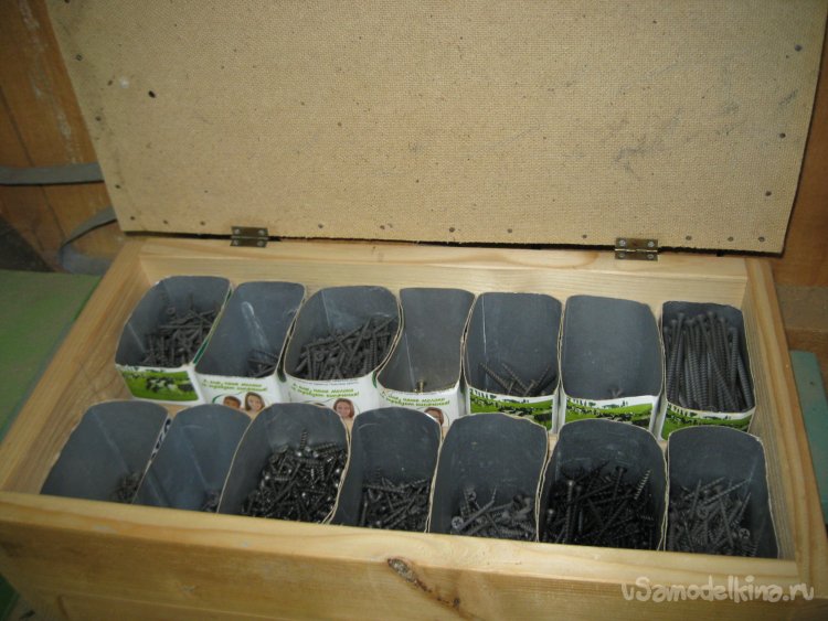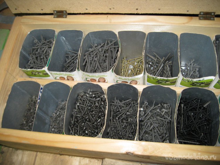 Кстати, я многие виды метизов и крепежа (особенно шурпы, гвозди и т.п.), также храню в подобных ящиках. Правда я в этом отношении, пошел по более легкому и, на мой взгляд, более удобному пути. Я тоже делаю деревянные ящики, но вместо внутренних отделений или ячеек, использую в них контейнеры, сделанные из картонных пакетов от молока.