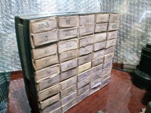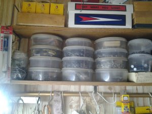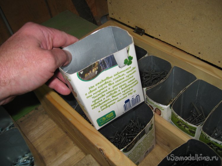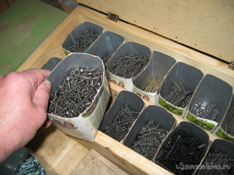 Как видно, шурупы разных размеров, хранятся не в ячейках, а в картонных молочных контейнерах, которыми гораздо удобнее пользоваться, чем, если бы в ящике были обычные ячейки.