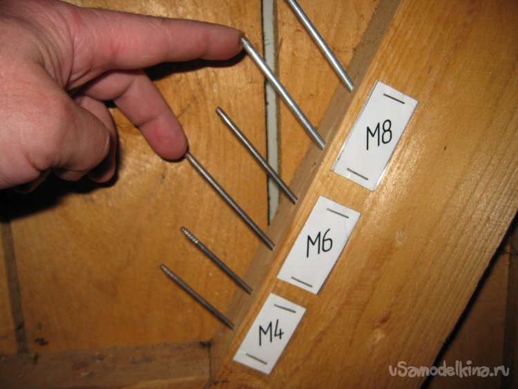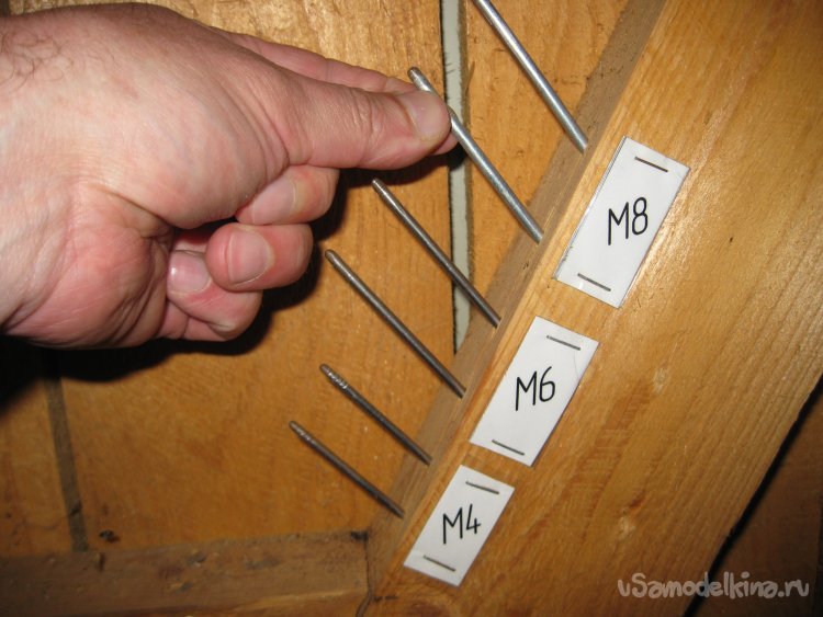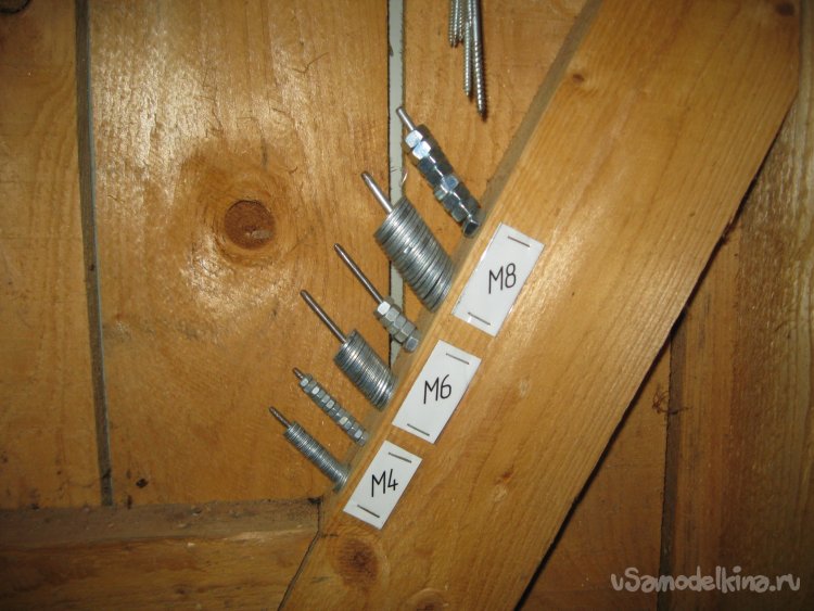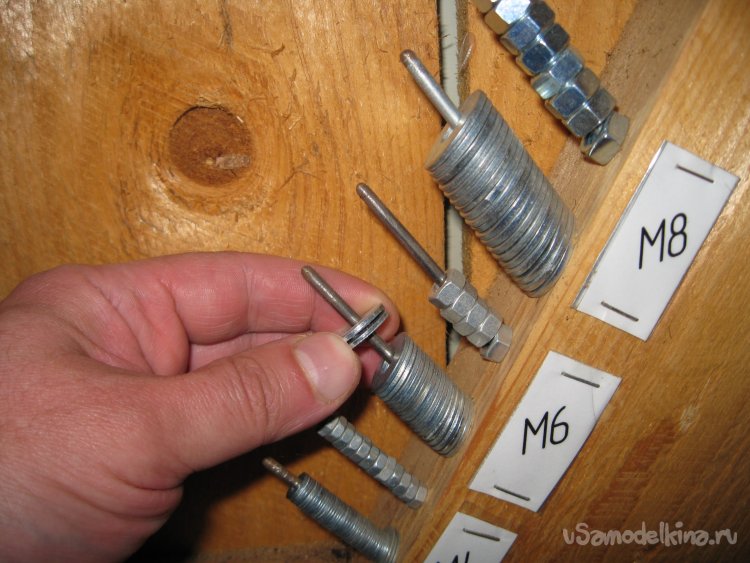 Причем опять же, нет необходимости делать такой органайзер для большого размерного ряда гаек и шайб. Я, например, сделал его для трех самых ходовых размеров: М4, М6 и М8. Как показала практика, гайки и шайбы этих типоразмеров, бывают востребованы намного чаще других.