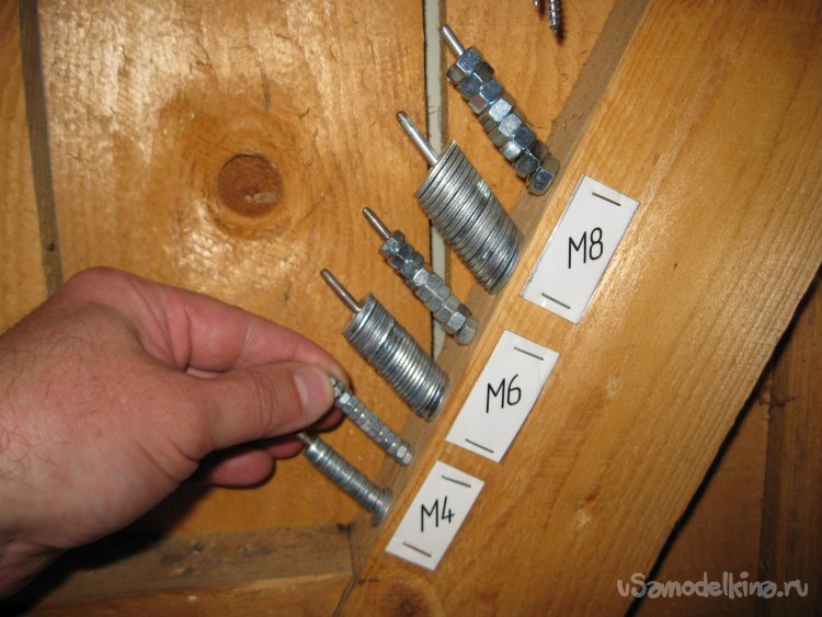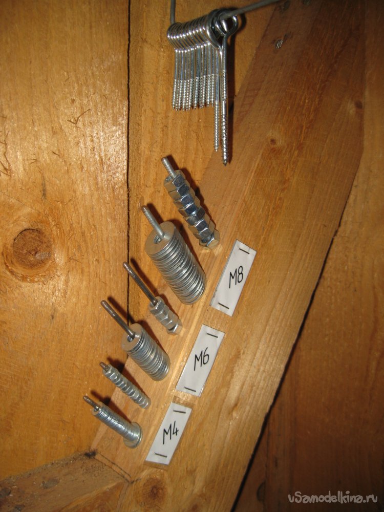 Ну, а затем мне оставалось только «зарядить» уже готовый органайзер, то есть нанизать на гвозди запас гаек и шайб, и моим органайзером можно было пользоваться.