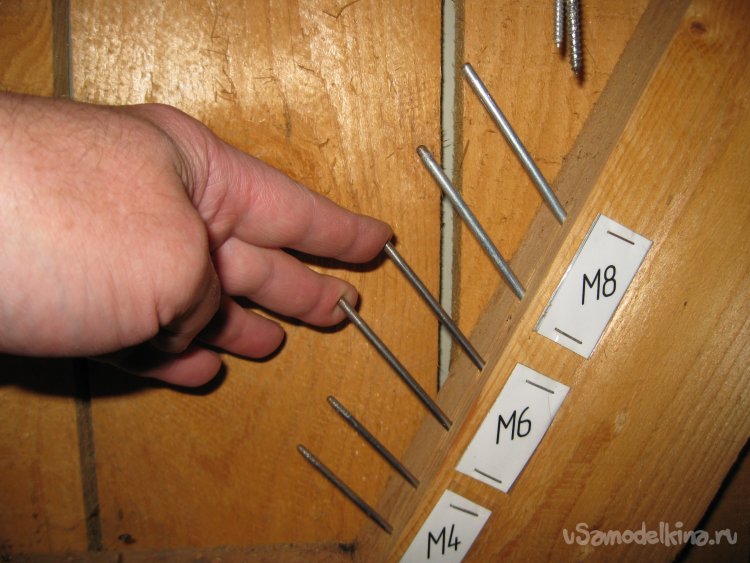 Для начала я нашел несколько гвоздей – по два одинаковых гвоздя для каждого типоразмера гаек и шайб. Желательно конечно брать гвозди подлиннее, но тут нужно помнить, что чем длиннее гвозди, тем больше их диаметр. И для небольших гаек они могут не подойти. Поэтому самые длинные и крупные гвозди, я использовал для гаек и шайб М8.